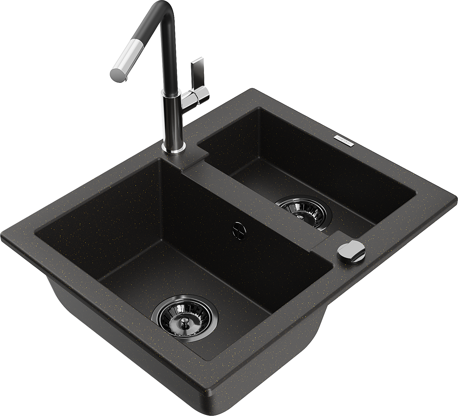 Mexen Carlos granitový dřez 1,5-komorový s kuchyňskou baterií Flora, černý/zlatý metalický - 6518-75-670401-07-B