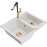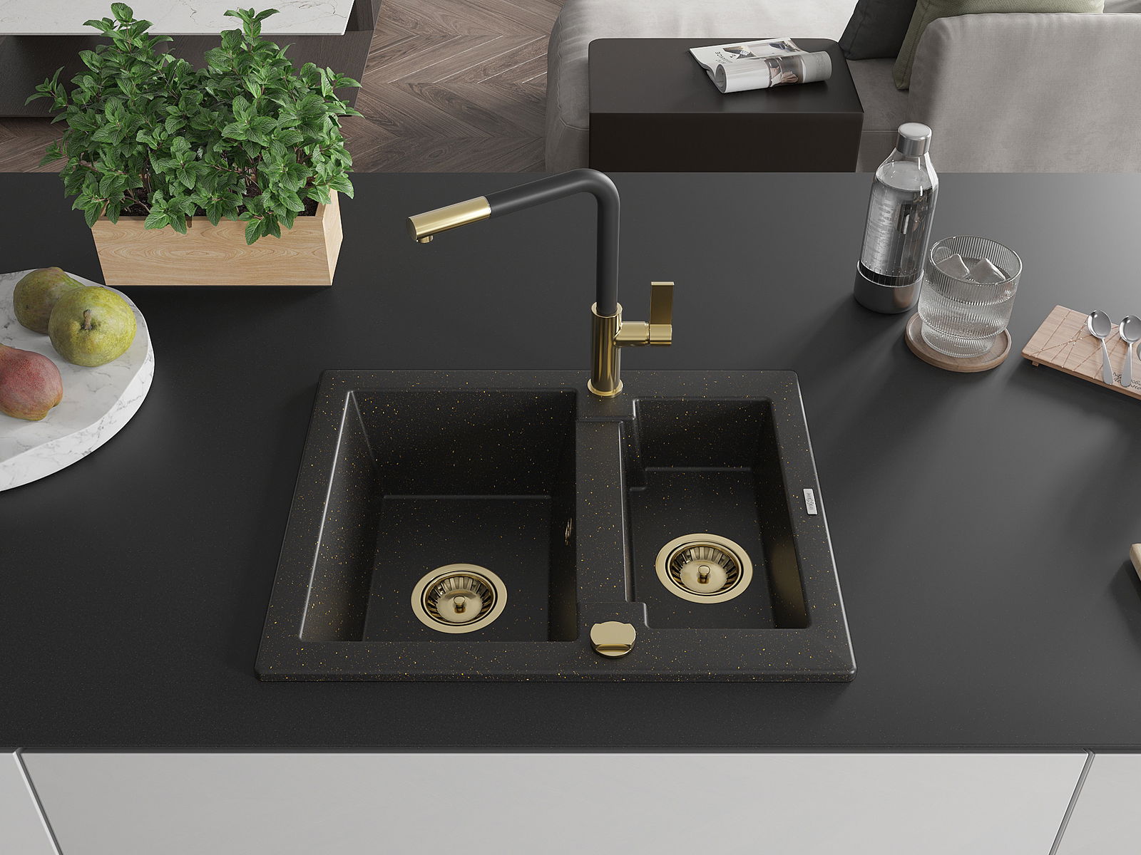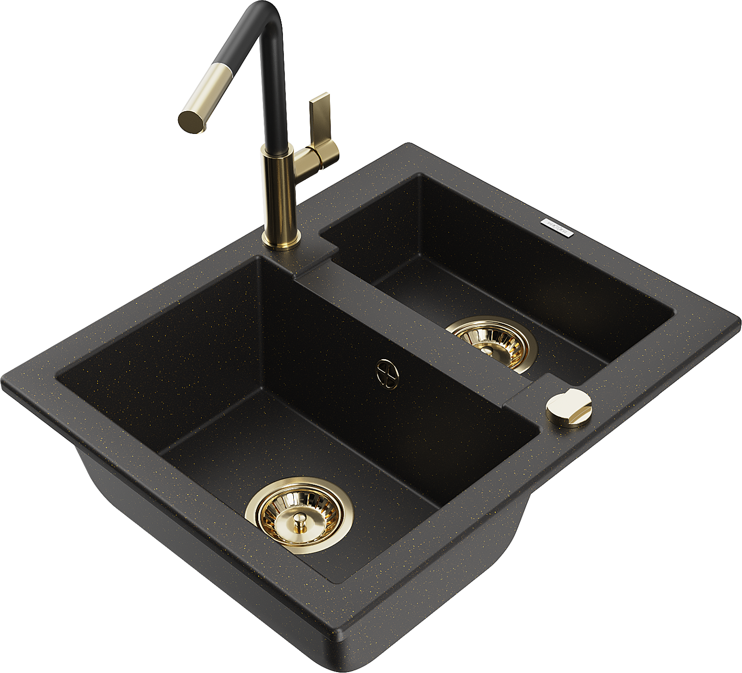 Mexen Carlos granitový dřez 1,5-komorový s kuchyňskou baterií Flora, černý/zlatý metalik - 6518-75-670401-57-G