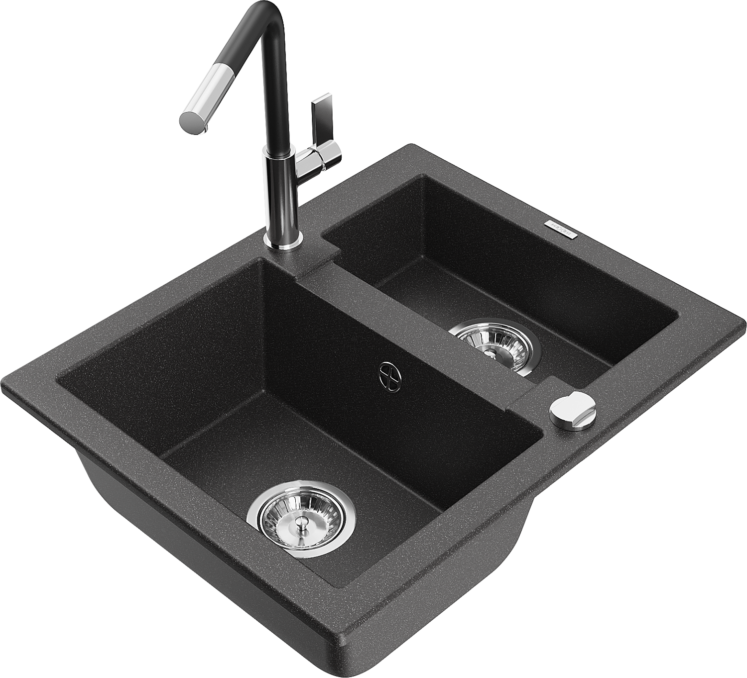 Mexen Carlos granitový dřez 1,5-komorový s kuchyňskou baterií Flora, černý s tečkami - 6518-76-670401-07