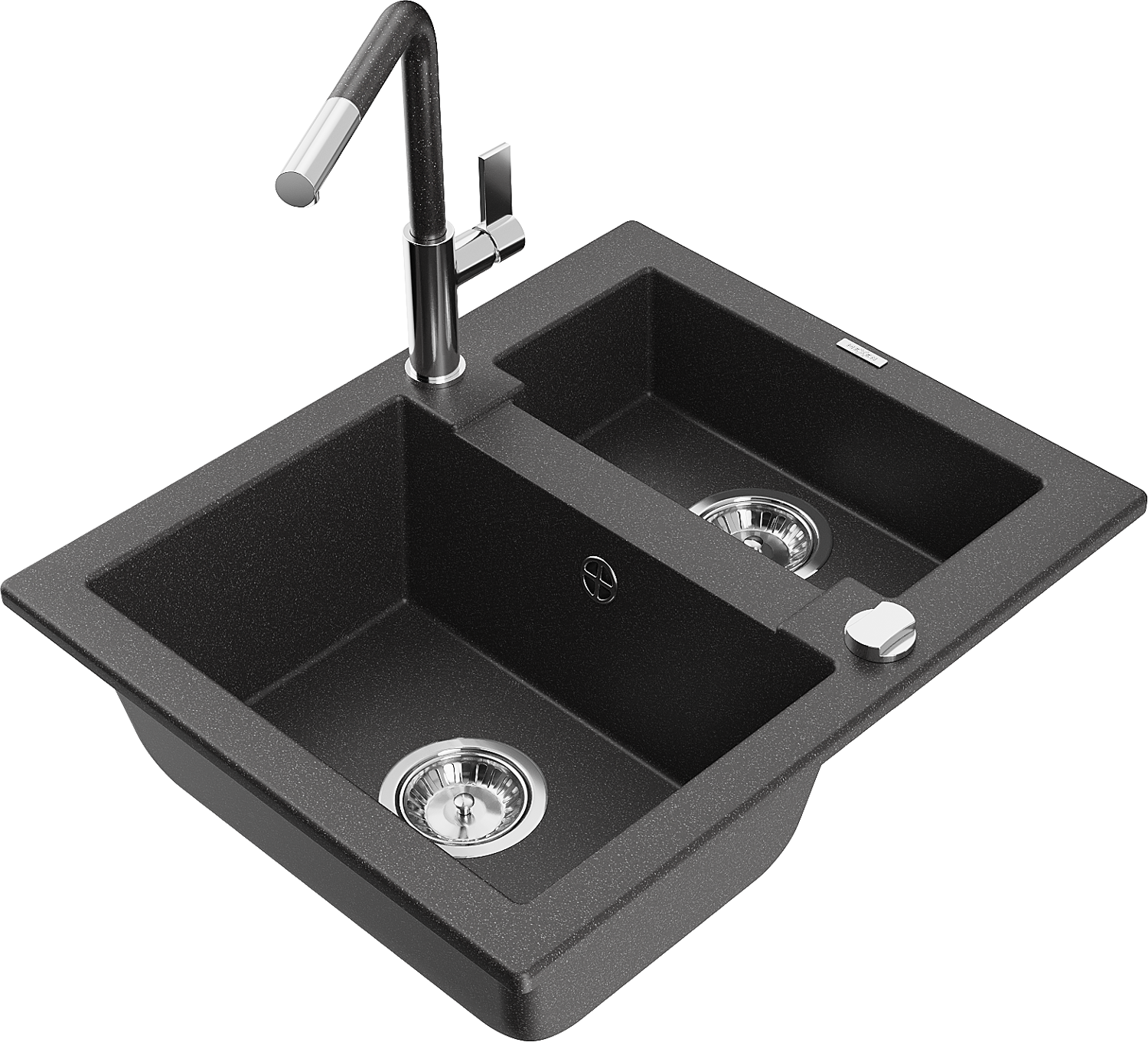 Mexen Carlos granitový dřez 1,5-komorový s kuchyňskou baterií Flora, černý skvrnitý - 6518-76-670401-08