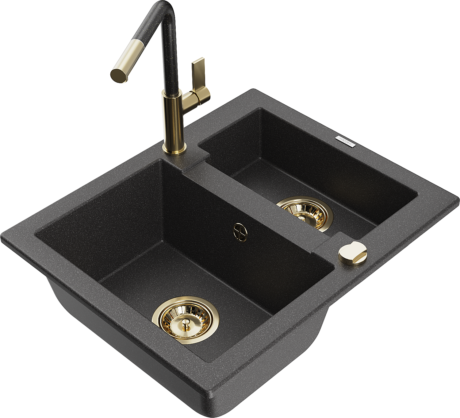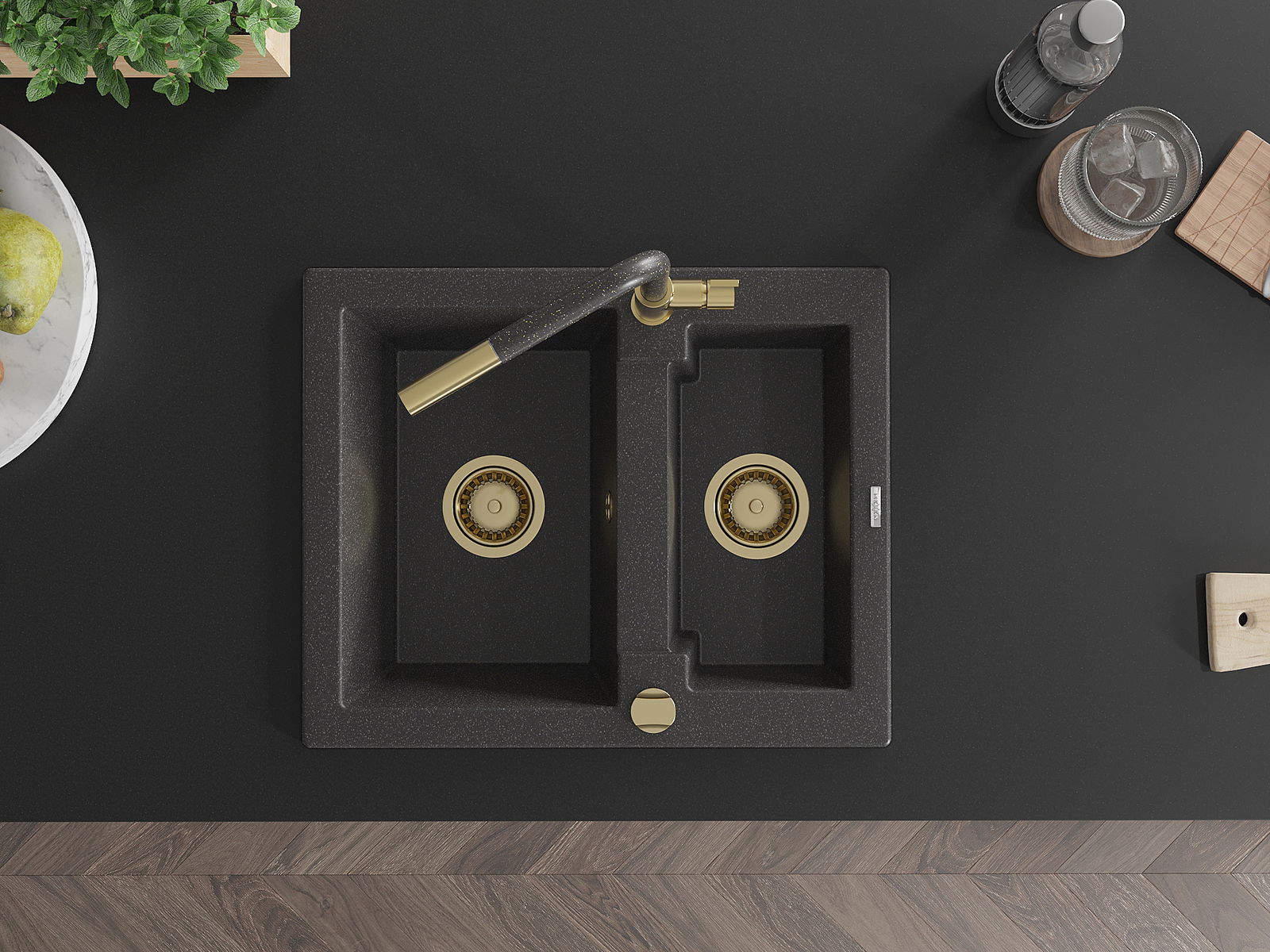 Mexen Carlos granitový dřez 1,5-komorový s kuchyňskou baterií Flora, černý s tečkami - 6518-76-670401-75-G