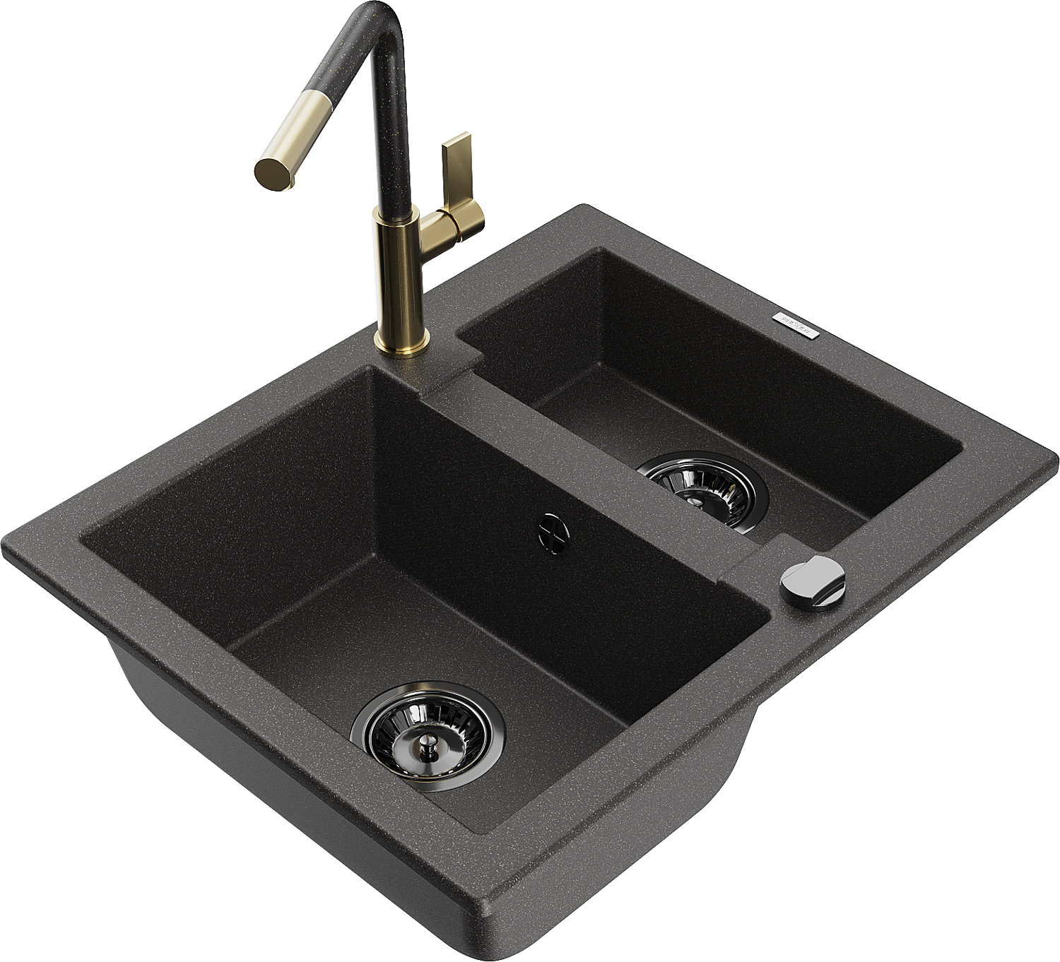 Mexen Carlos granitový dřez 1,5-komorový s kuchyňskou baterií Flora, černý s bílými skvrnami - 6518-76-670401-75-B