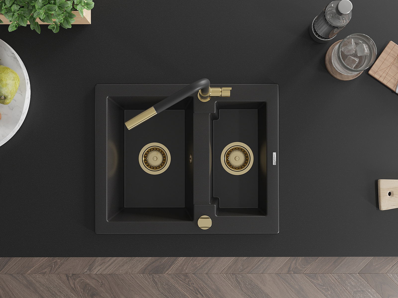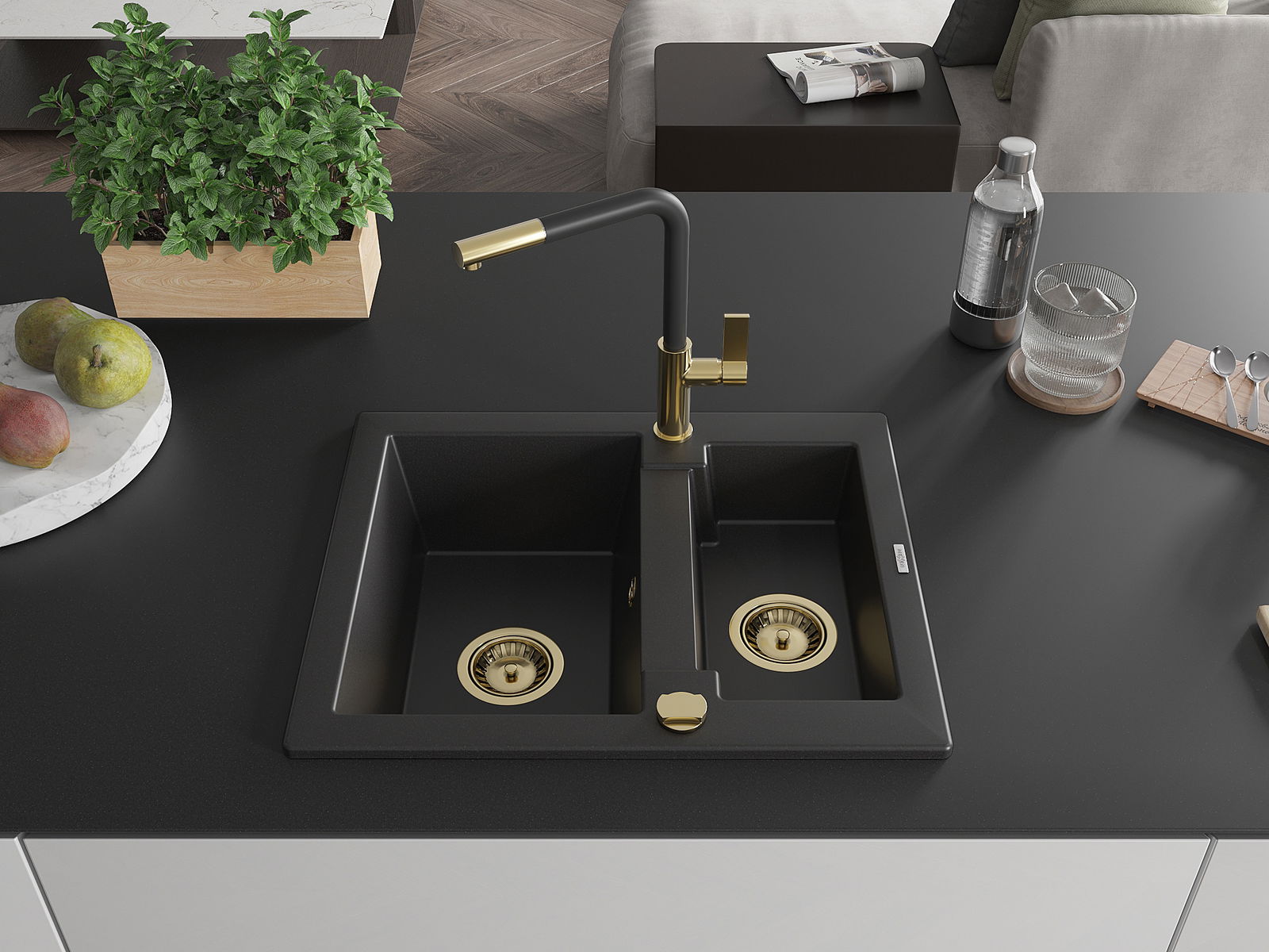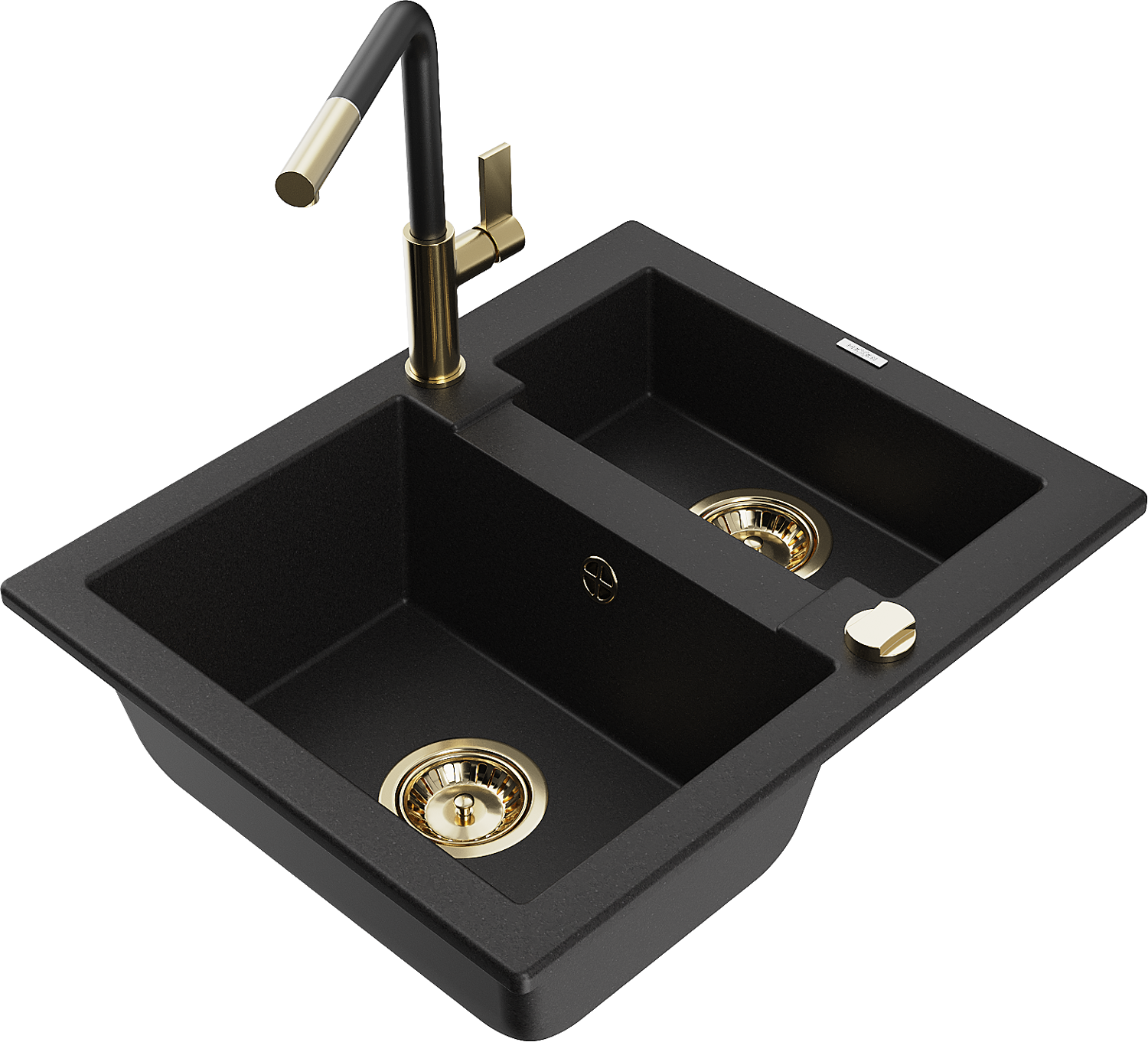 Mexen Carlos granitový dřez 1,5-komorový s kuchyňskou baterií Flora, černý - 6518-77-670401-57-G
