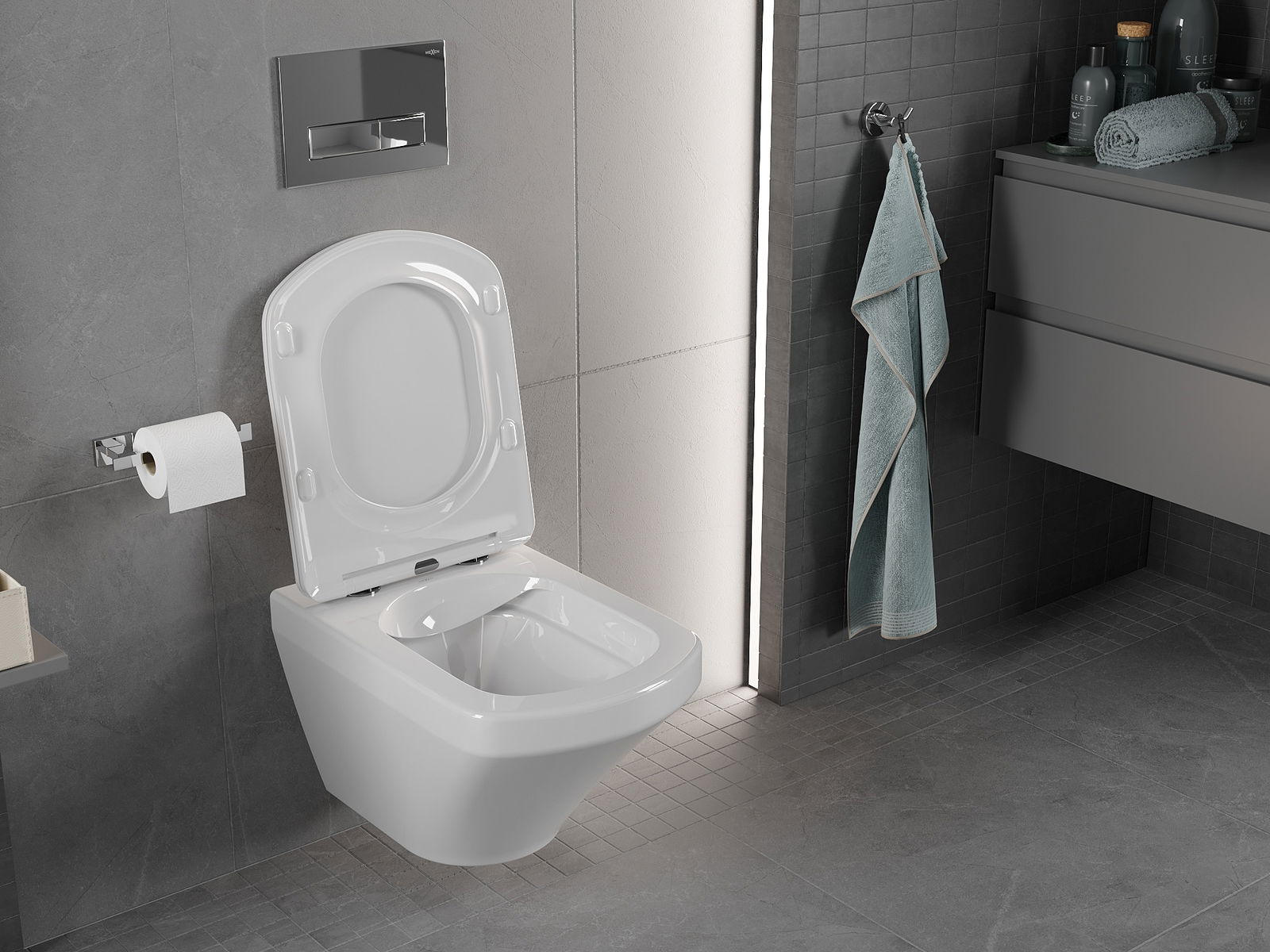 Tenká deska s výjimečně ergonomickým tvarem a mimořádně štíhlým vzhledem. Konstrukce se dokonale přizpůsobí modernímu interiéru koupelny, dodává pocit lehkosti. Skvělá volba pro minimalistická uspořádání.
