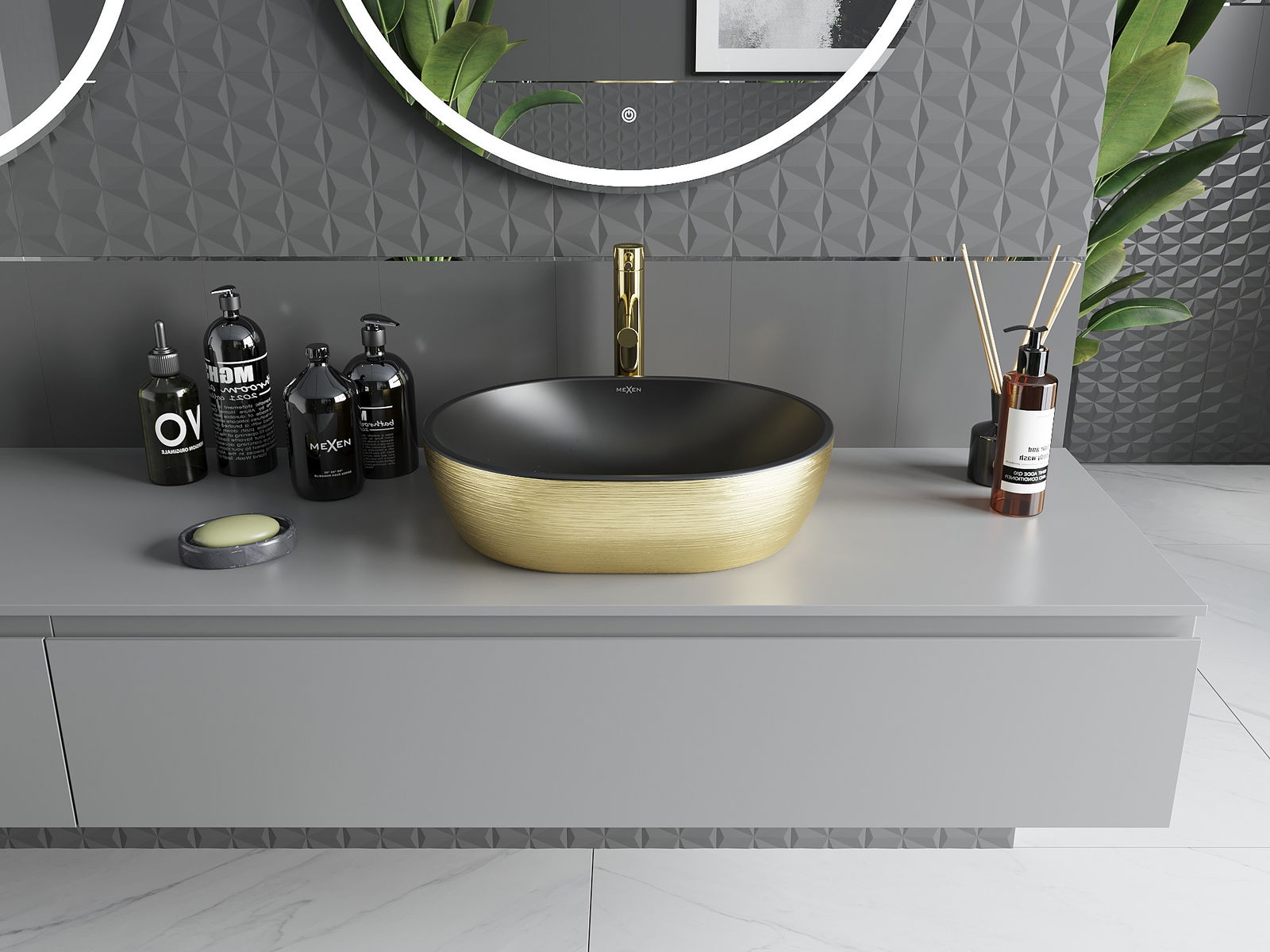 Umyvadlo na desku je ideálním řešením pro moderní interiéry. S rozměry 48x35 cm a hloubkou 11,5 cm, se dokonale hodí do každé koupelny. Jeho elegantní černý matný povrch se zlatým liniovým vzorem je kombinací stylu a funkčnosti. Vyrobené z vysoce kvalitní sanitární keramiky, umyvadlo je nejen estetické, ale také odolné. Bez otvorů pro baterii a přepad, představuje minimalistický design, který podtrhne charakter vašeho prostoru.
