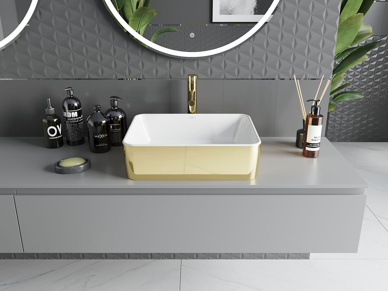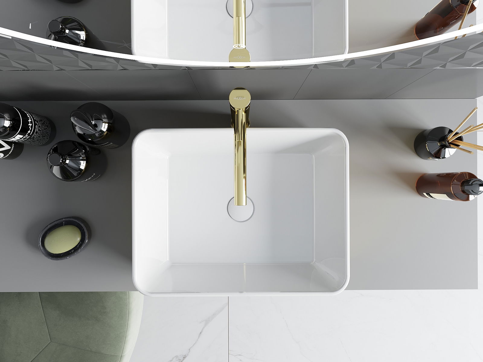Umyvadlo na desku se vyznačuje elegantním bílým a zlatým provedením, které přináší do každé koupelny nádech luxusu. Jeho rozměry 48x37 cm a hloubka 10,5 cm ho činí ideálním pro menší prostory. Vyrobeno z vysoce kvalitní sanitární keramiky, umyvadlo zajišťuje nejen estetický vzhled, ale i odolnost. Navíc, absence otvorů na baterii a přepad zdůrazňuje minimalistický design, a matný povrch usnadňuje údržbu čistoty.