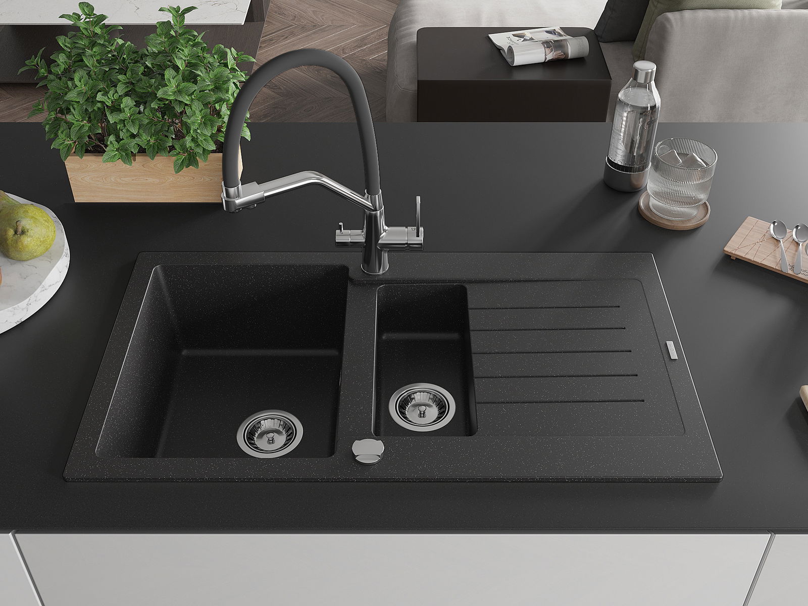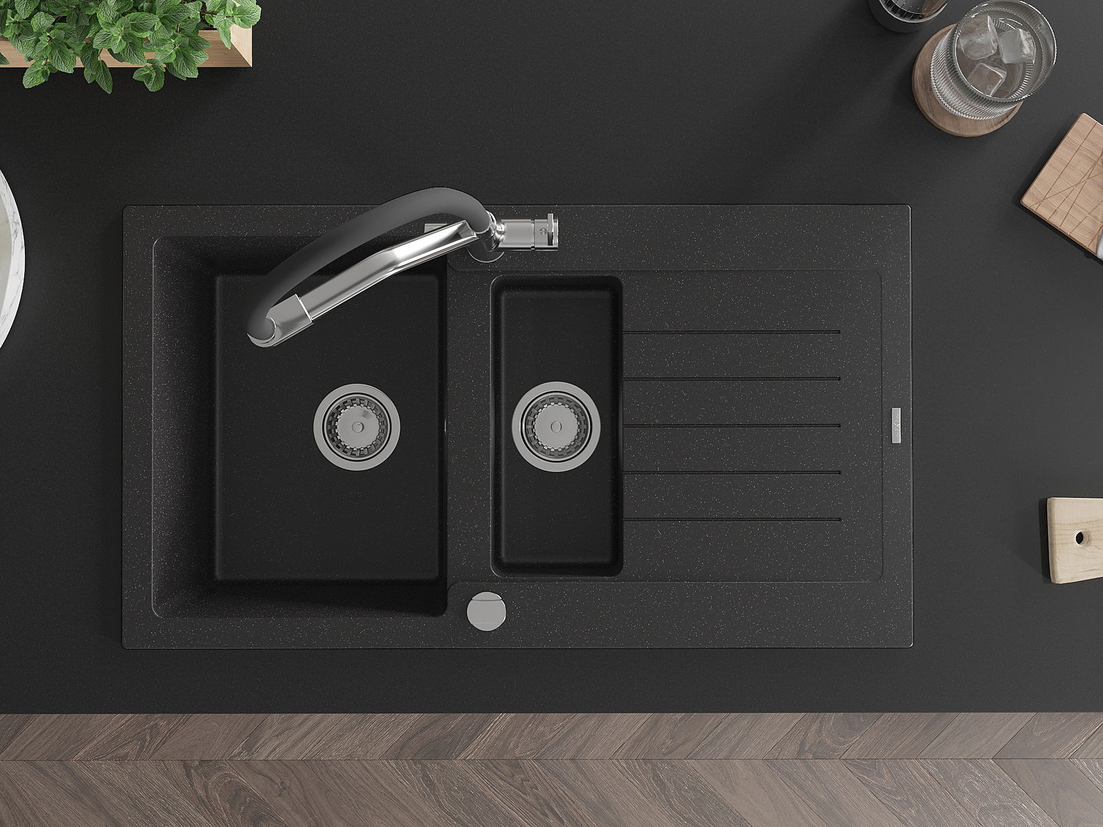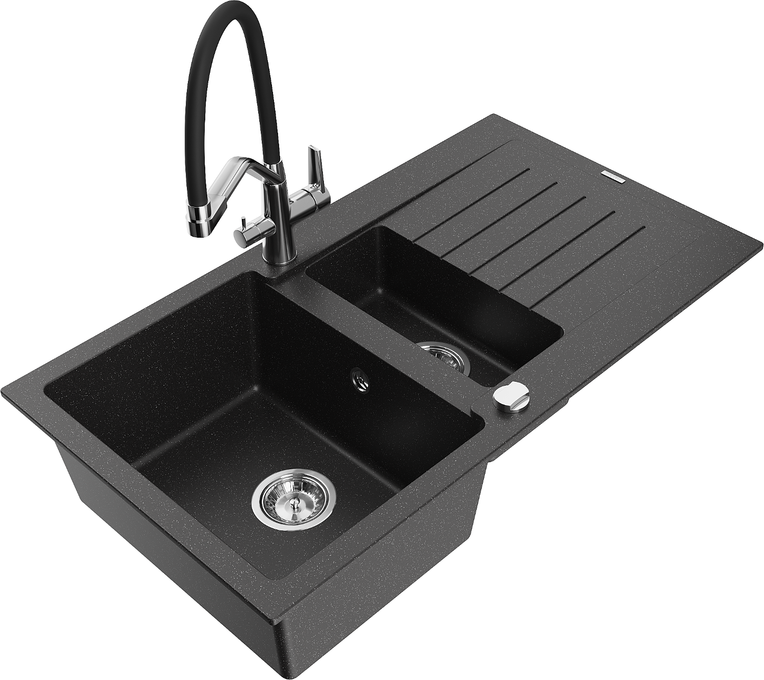 Mexen Matias dřez granitový 1,5-komorový s odkapávačem a kuchyňskou baterií Duo, černý/stříbrný metalik - 6502-73-671701-07