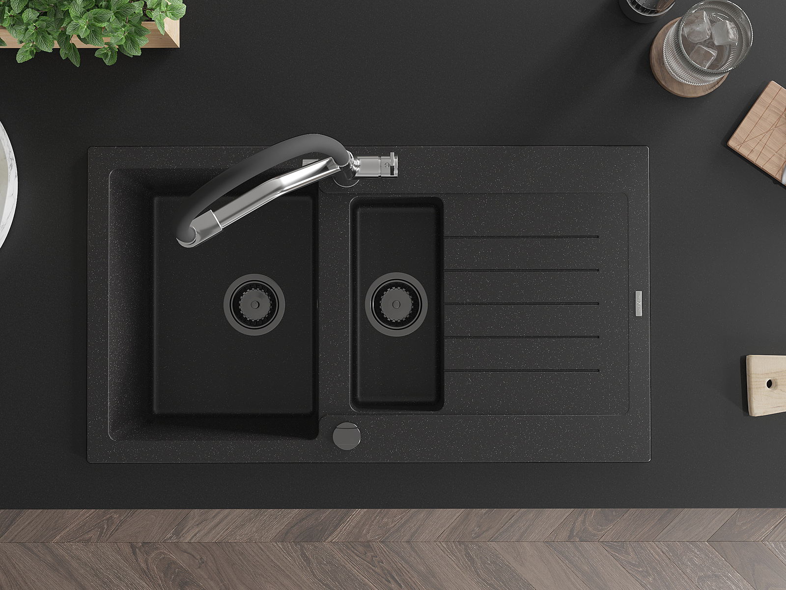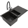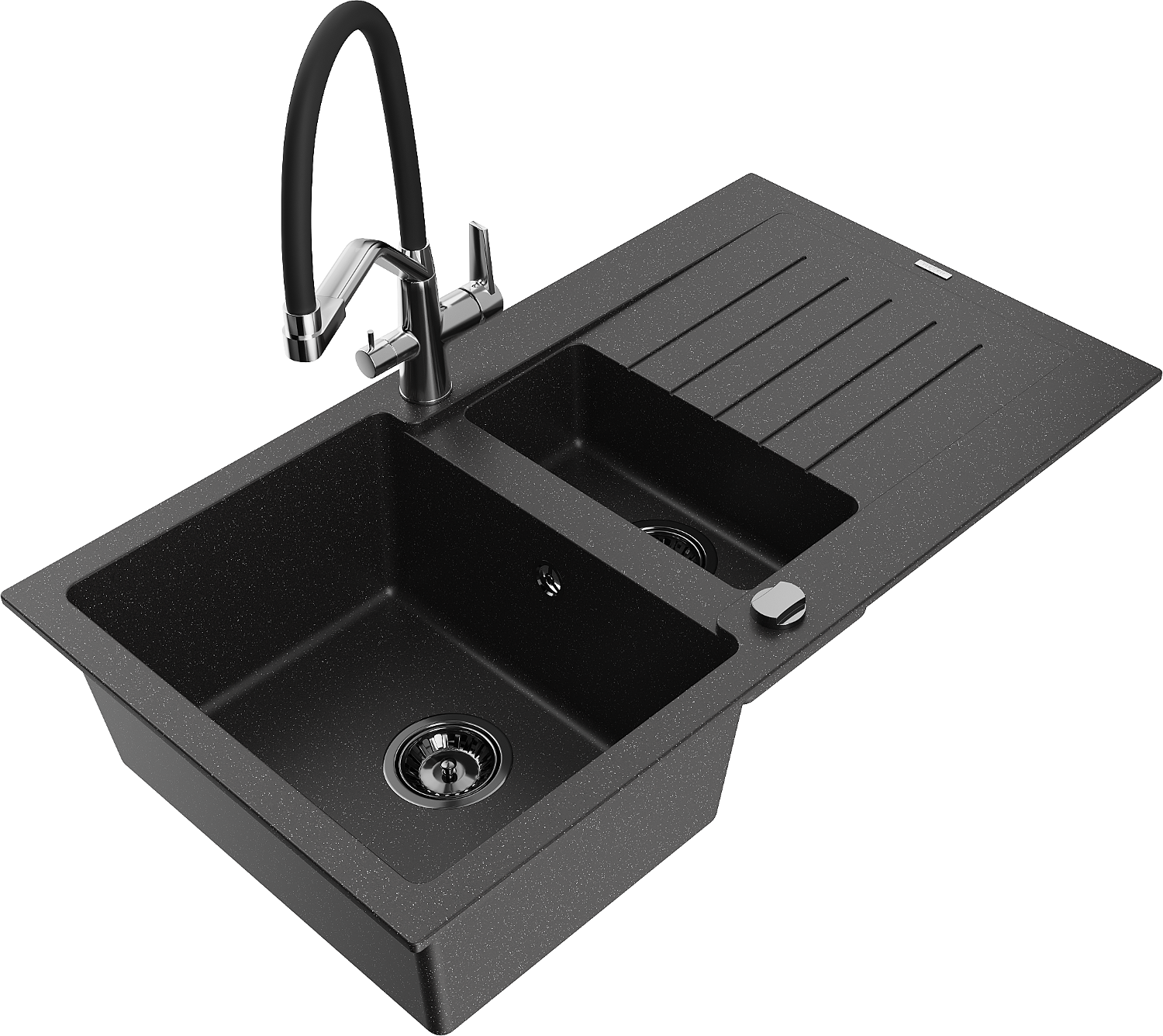 Mexen Matias žulový dřez 1,5-komorový s odkapávačem a kuchyňskou baterií Duo, černý/stříbrný - 6502-73-671701-07-B
