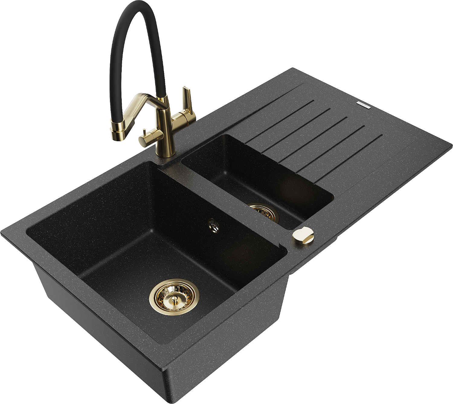 Mexen Matias granitový dřez 1,5-komorový s odkapávačem a kuchyňskou baterií Duo, černý/stříbrný - 6502-73-671701-57-G