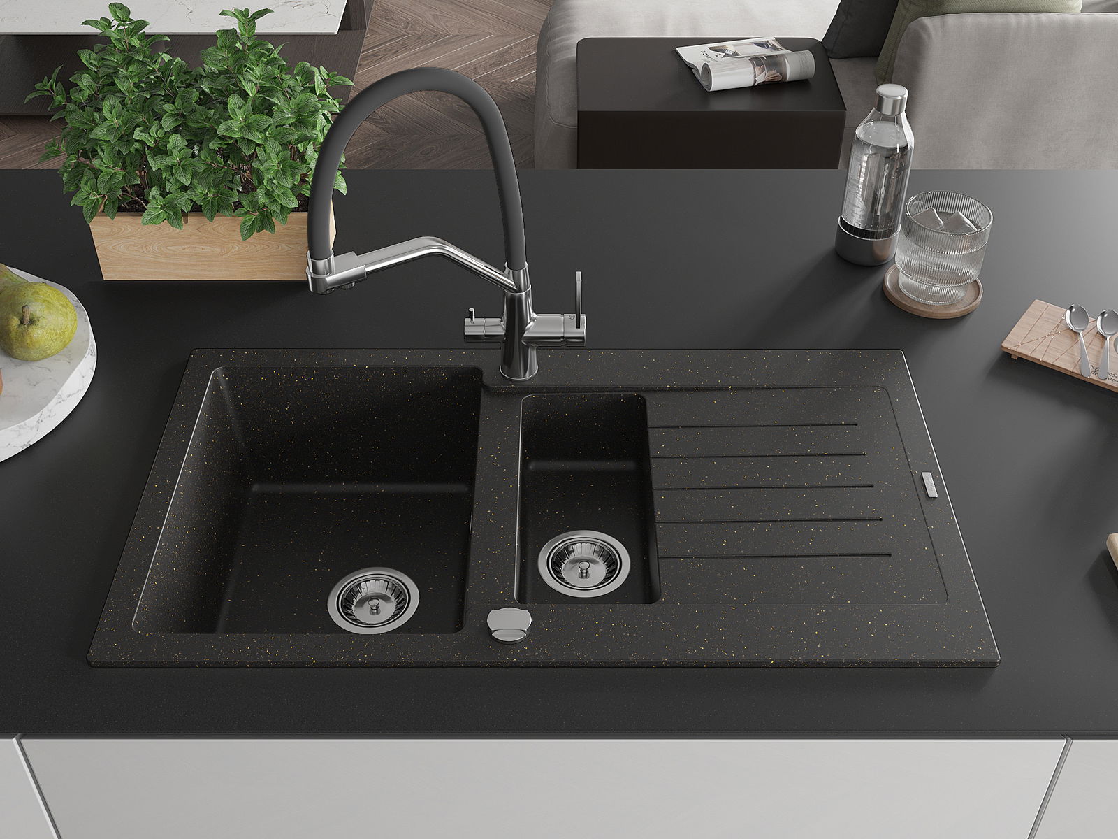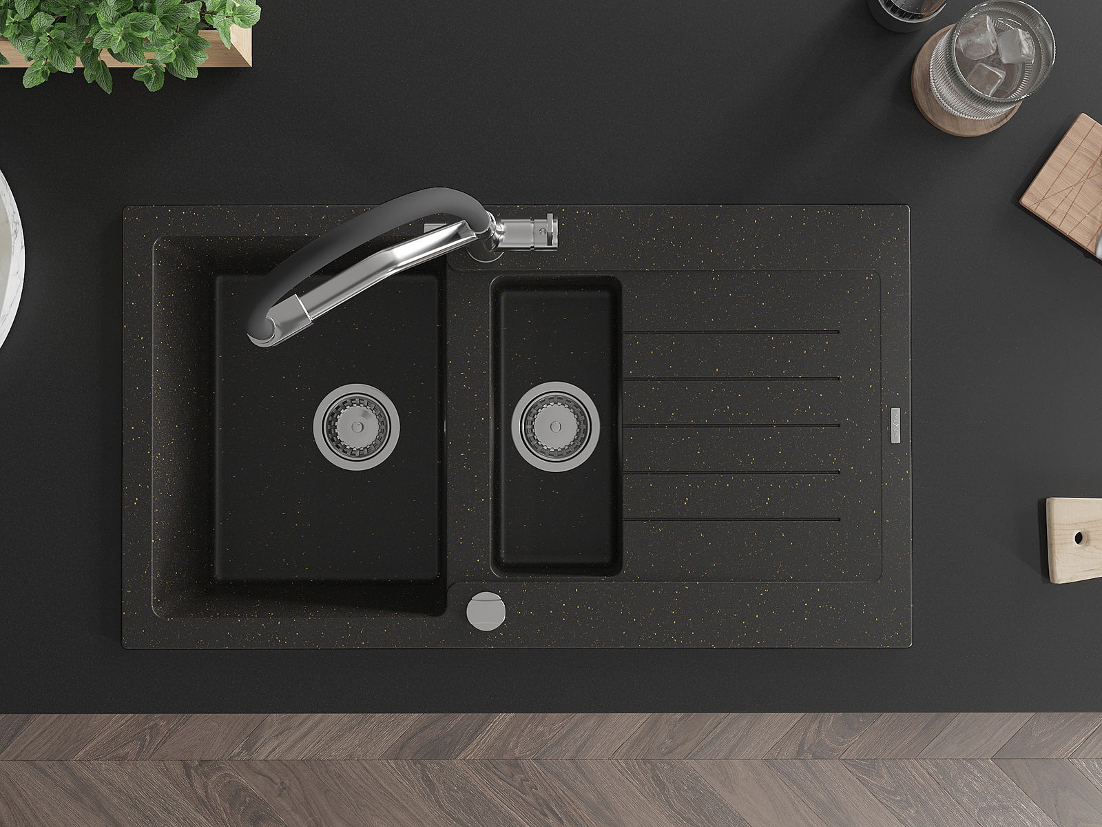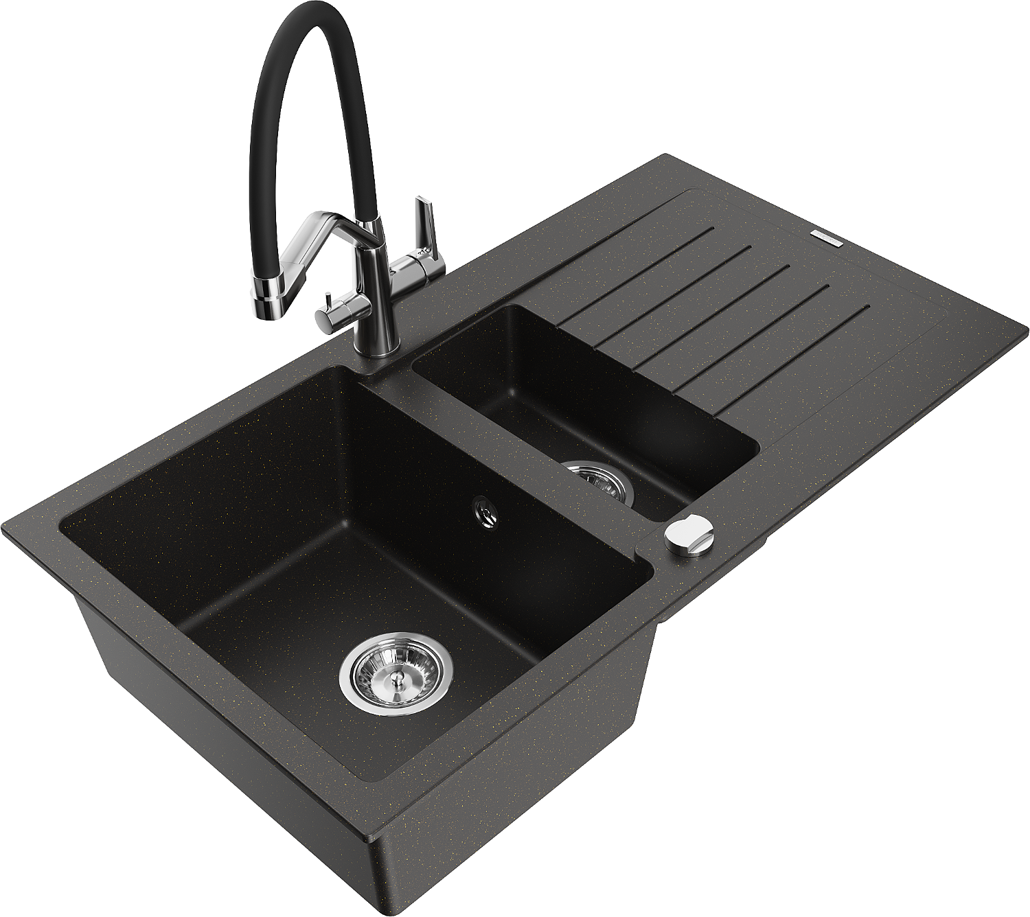 Mexen Matias granitový dřez 1,5-komorový s odkapávačem a kuchyňskou baterií Duo, černý/zlatý metalik - 6502-75-671701-07