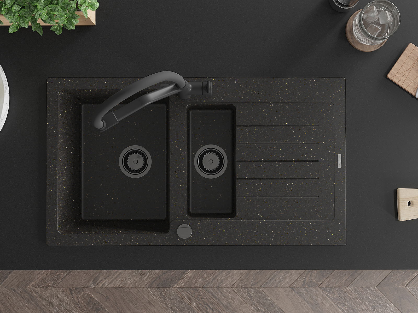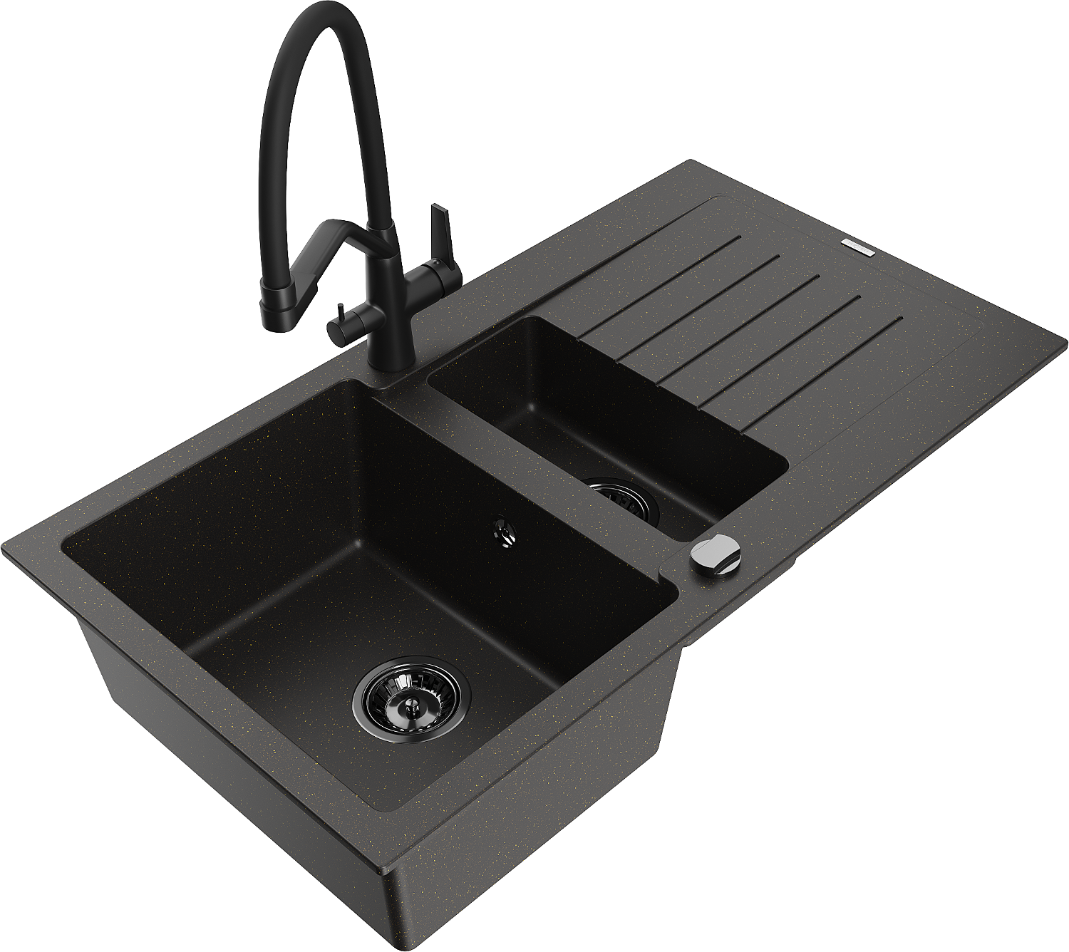 Mexen Matias žulový dřez 1,5-komorový s odkapávačem a kuchyňskou baterií Duo, černý/zlatý metalický - 6502-75-671701-70-B