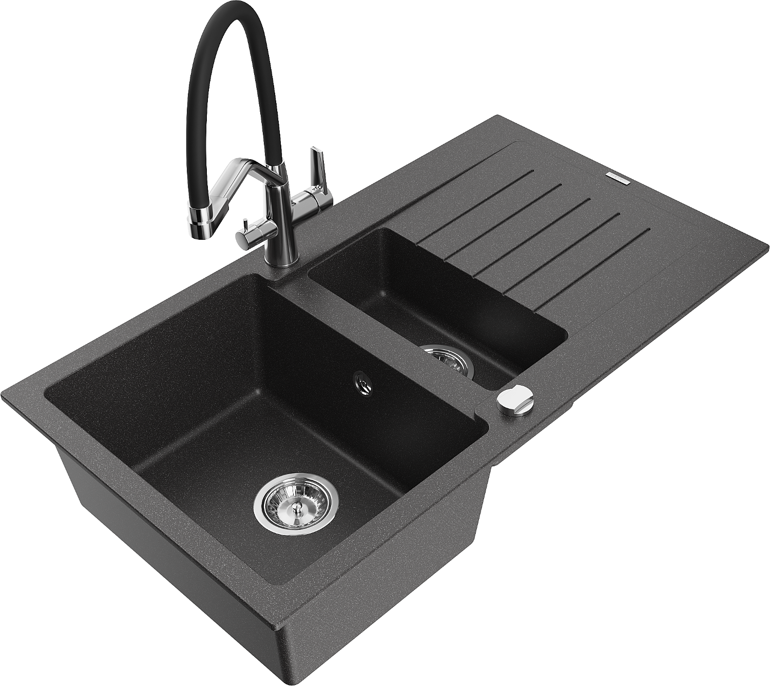 Mexen Matias granitový dřez 1,5-komorový s odkapávačem a kuchyňskou baterií Duo, černý tečkovaný - 6502-76-671701-07