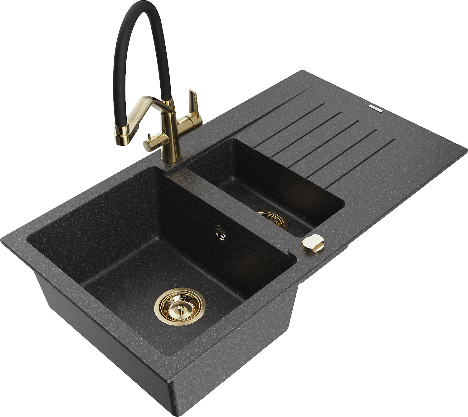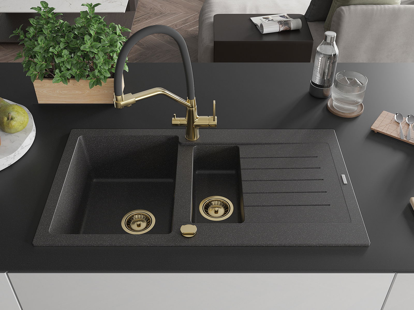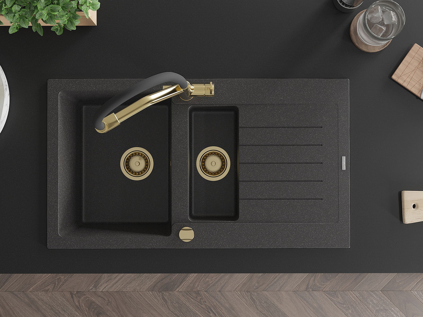 Mexen Matias žulový dřez 1,5-komorový s odkapávačem a kuchyňskou baterií Duo, černý s tečkami - 6502-76-671701-57-G