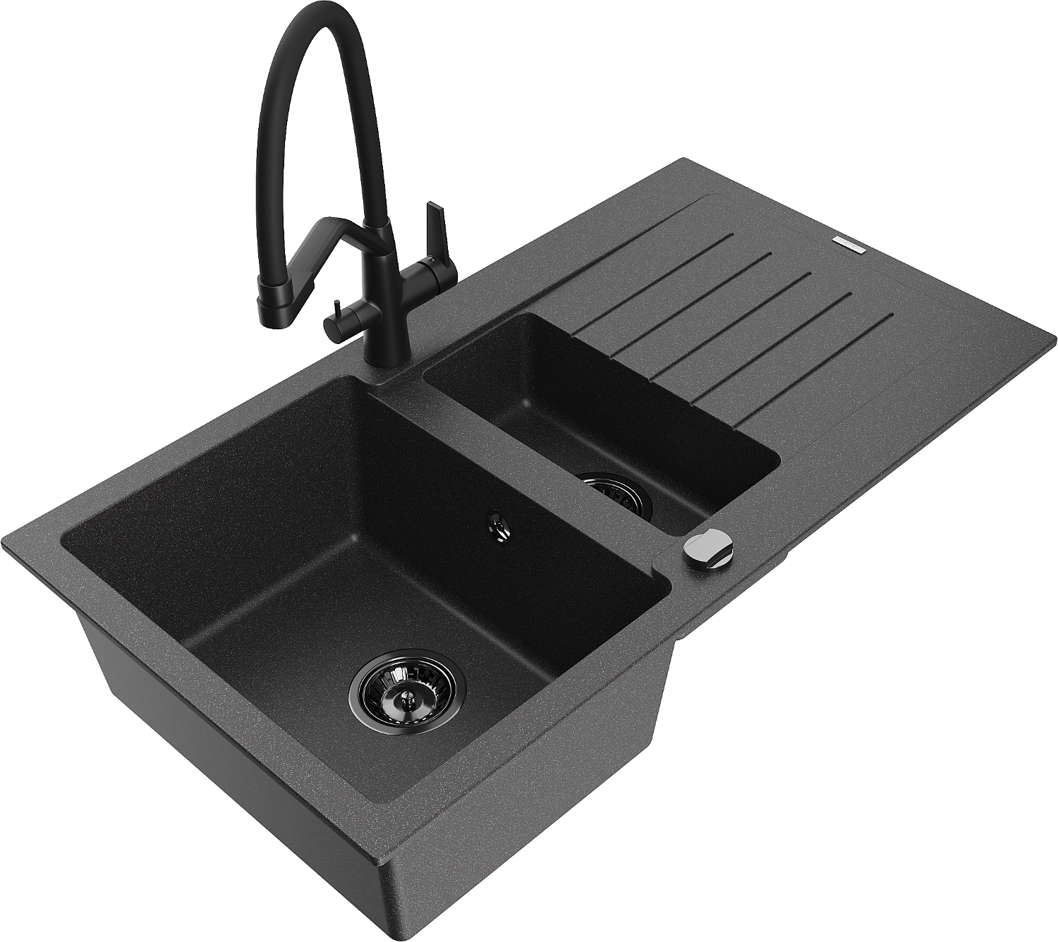 Mexen Matias žulový dřez 1,5 komorový s odkapávačem a kuchyňskou baterií Duo, černý skvrnitý - 6502-76-671701-70-B