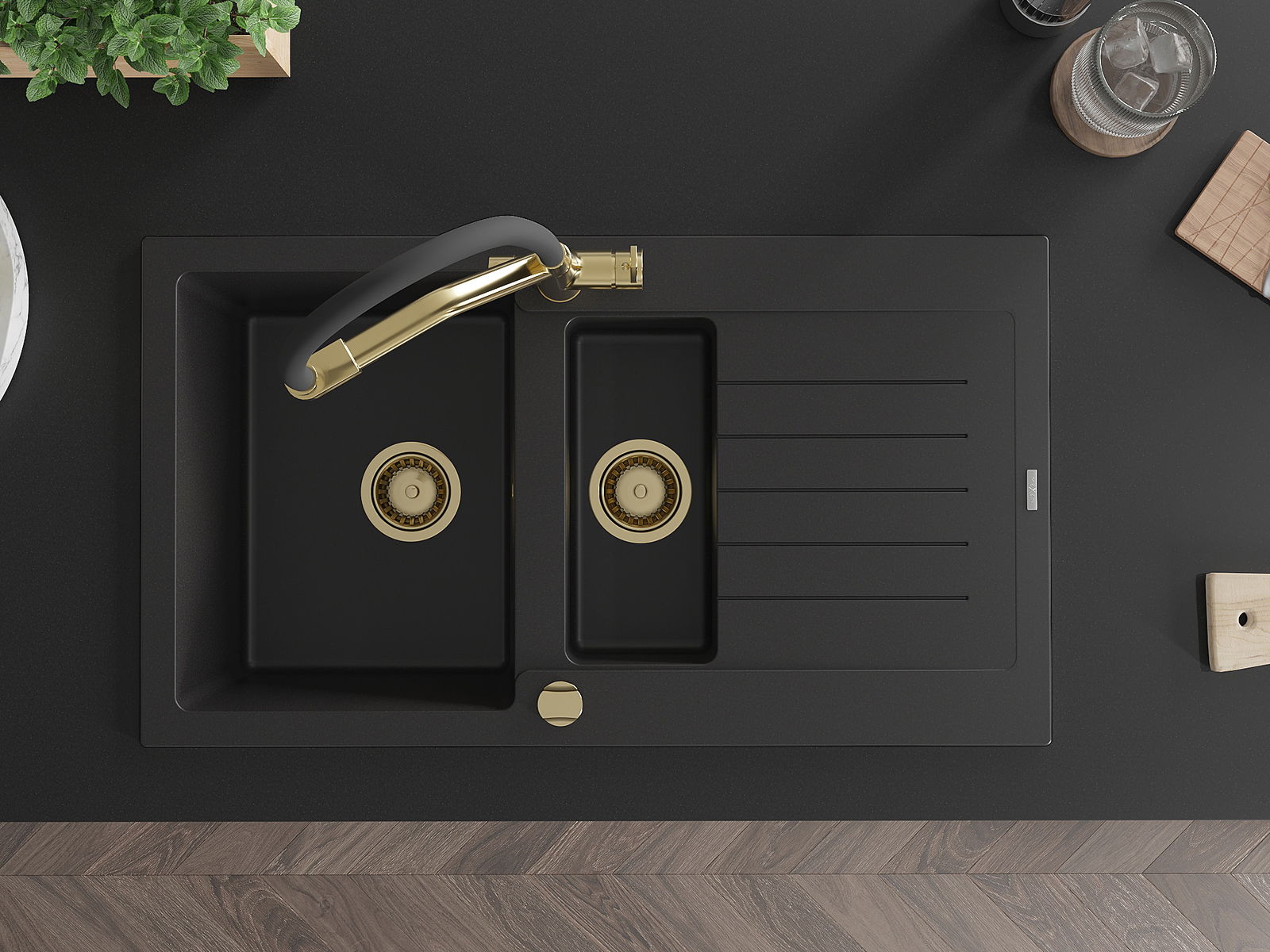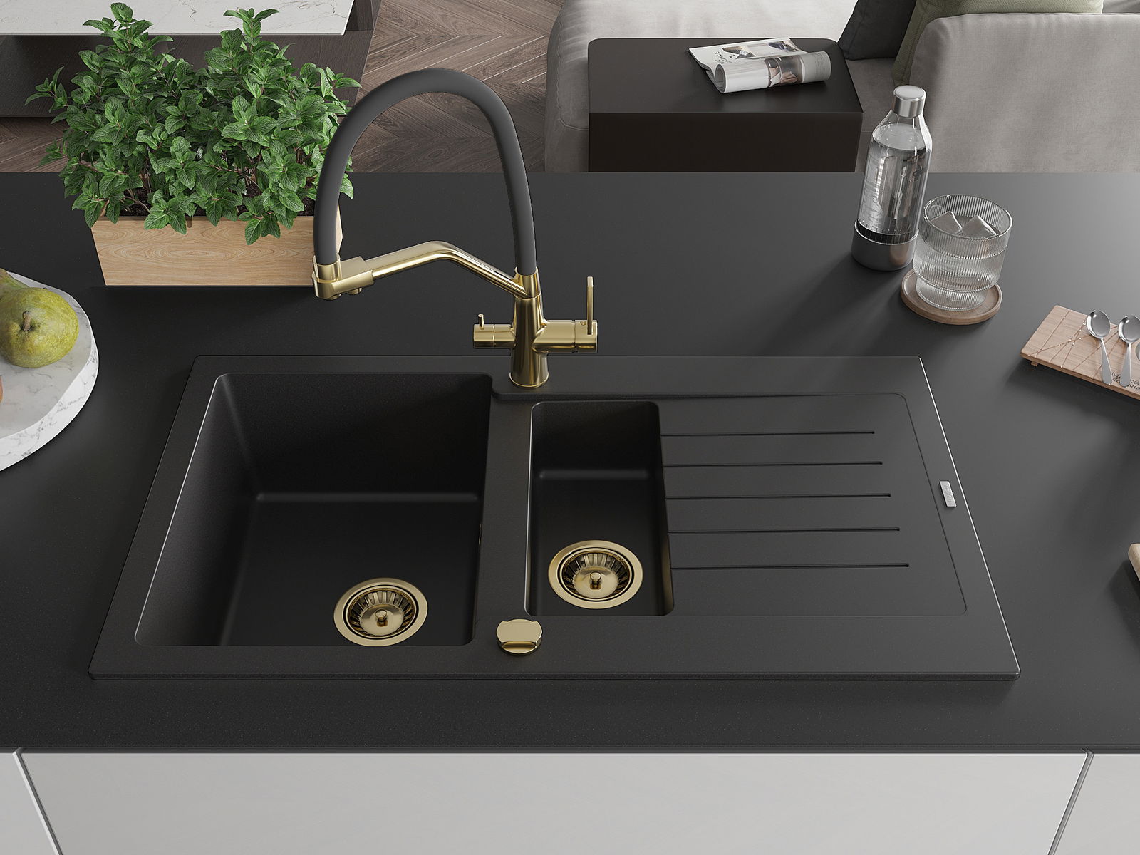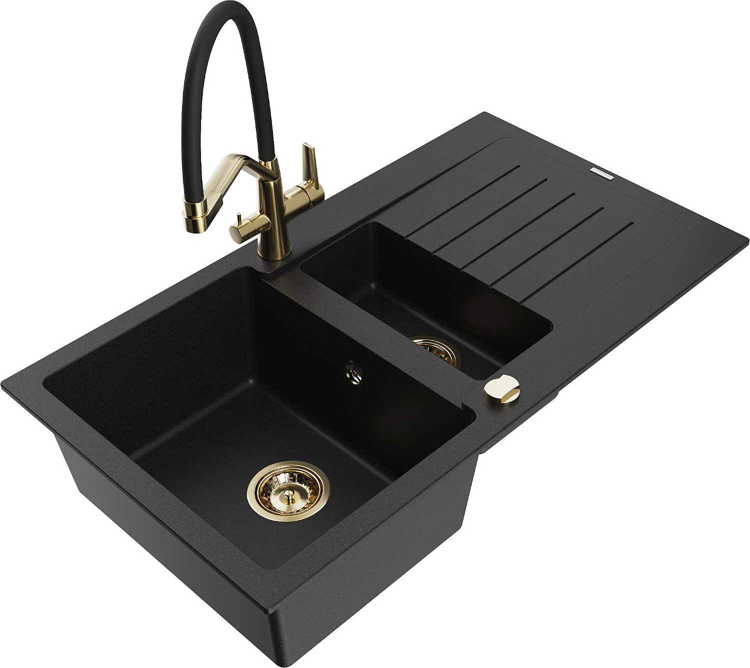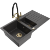 Mexen Matias granitový dřez 1,5-komorový s odkapávačem a kuchyňskou baterií Duo, černý - 6502-77-671701-57-G