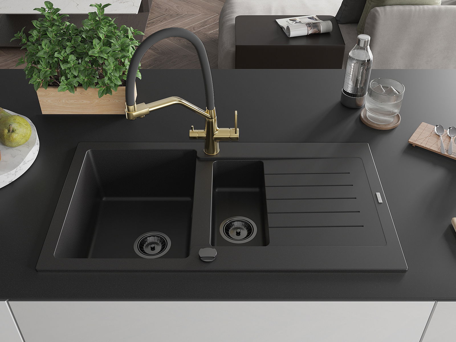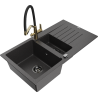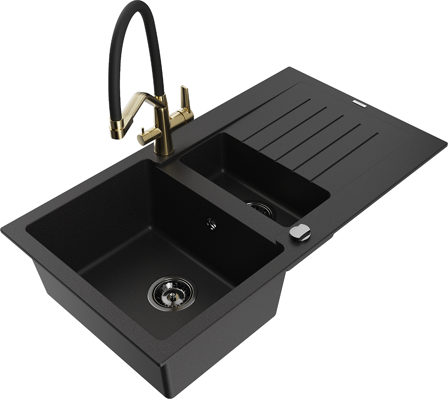 Mexen Matias granitový dřez 1,5-komorový s odkapávačem a kuchyňskou baterií Duo, černý - 6502-77-671701-57-B