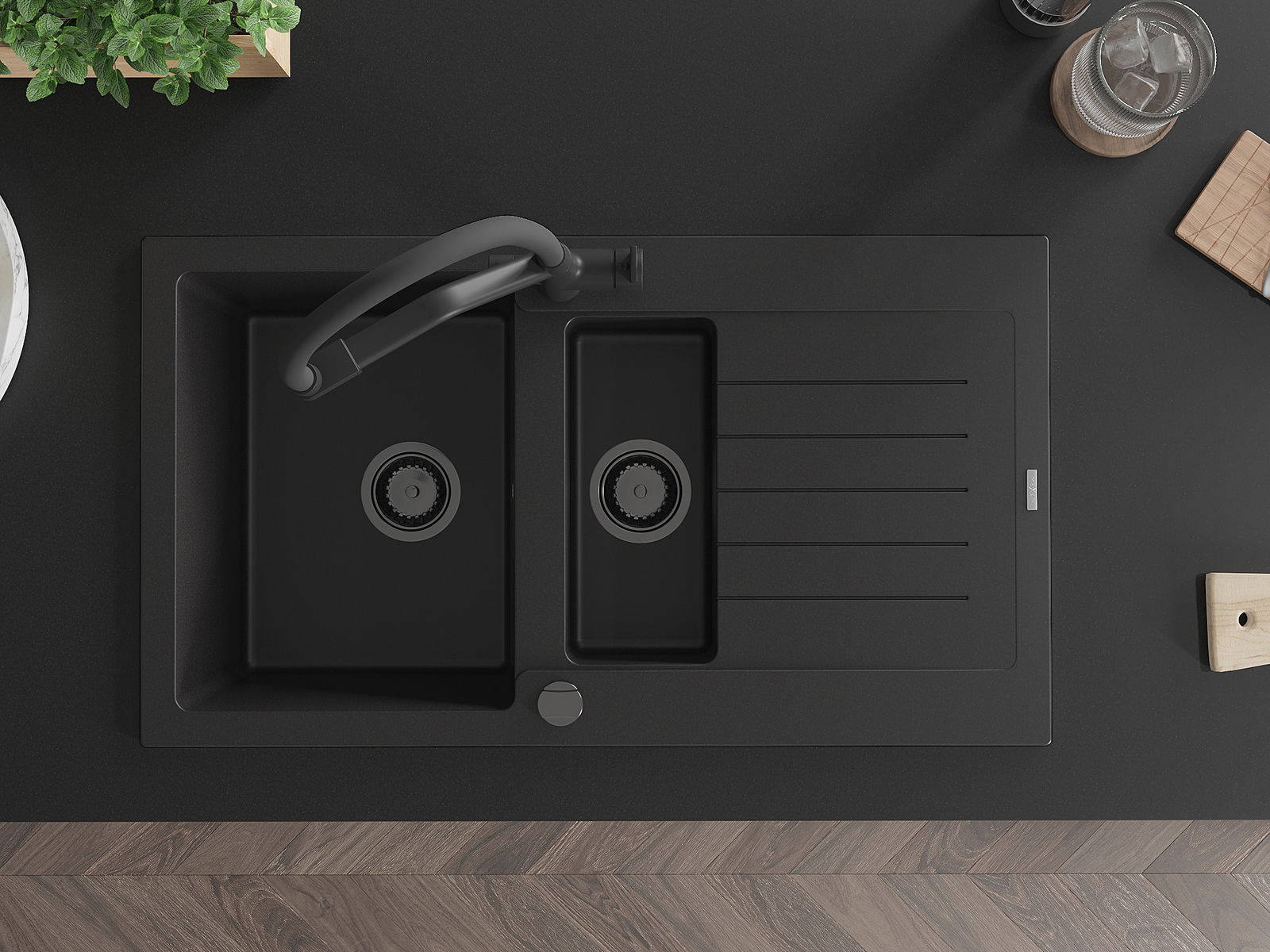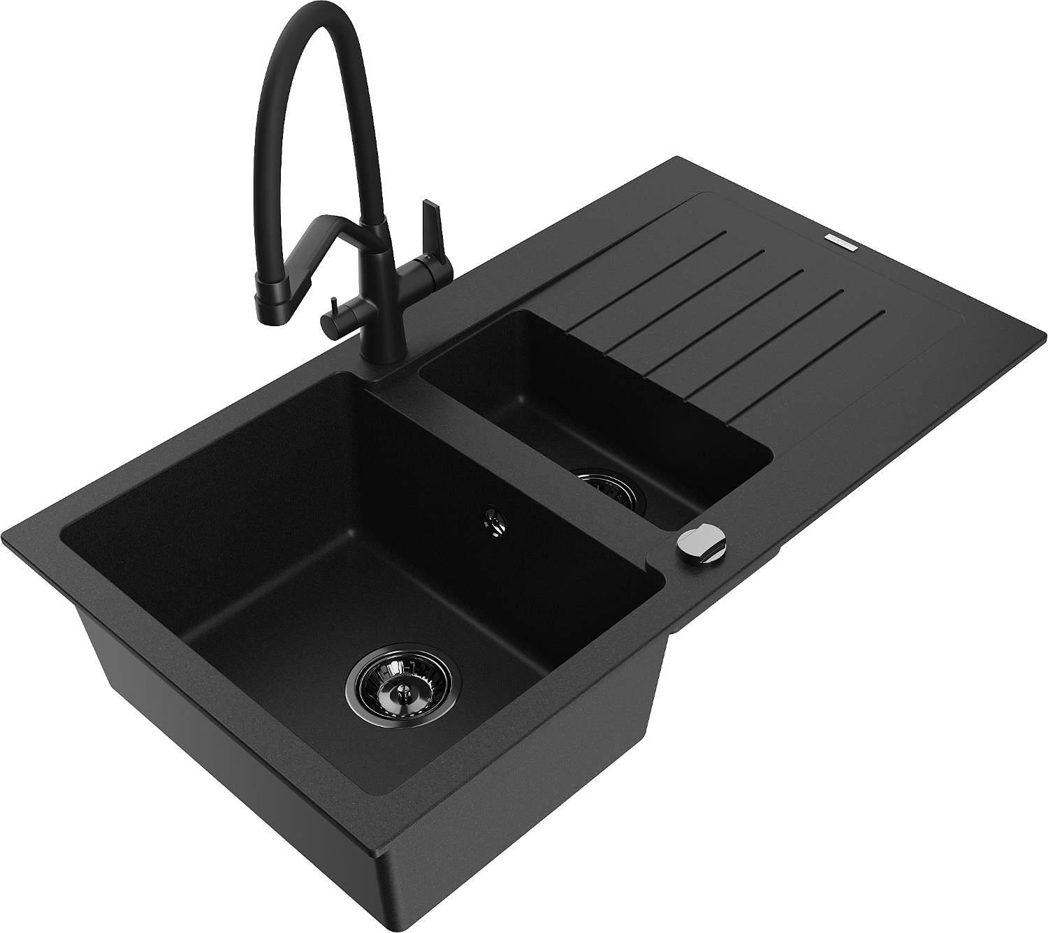 Mexen Matias granitový dřez 1,5-komorový s odkapávačem a kuchyňskou baterií Duo, černý - 6502-77-671701-70-B
