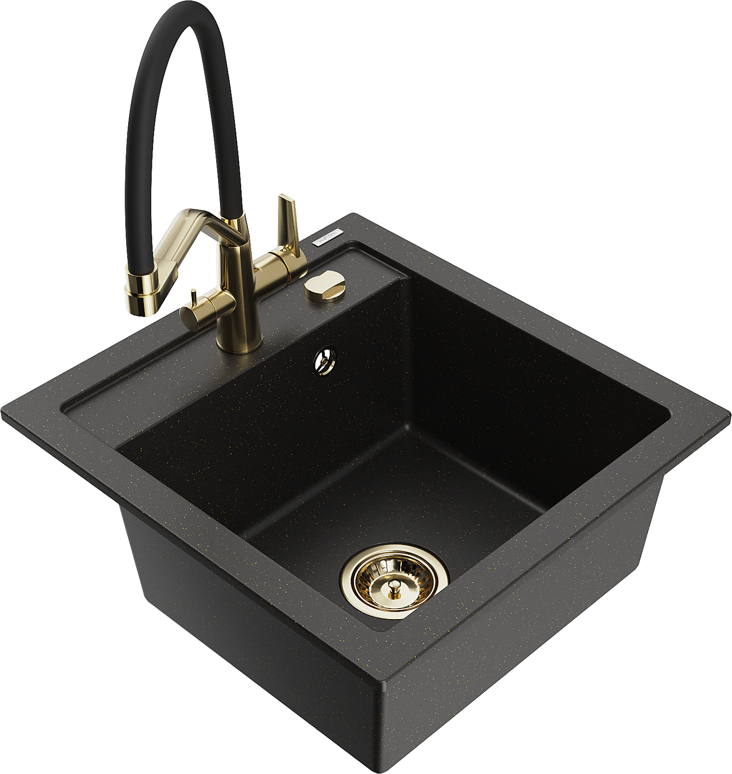 Mexen Vito granitový dřez 1-komorový s kuchyňskou baterií Duo, černý/zlatý metalik - 6503-75-671701-57-G