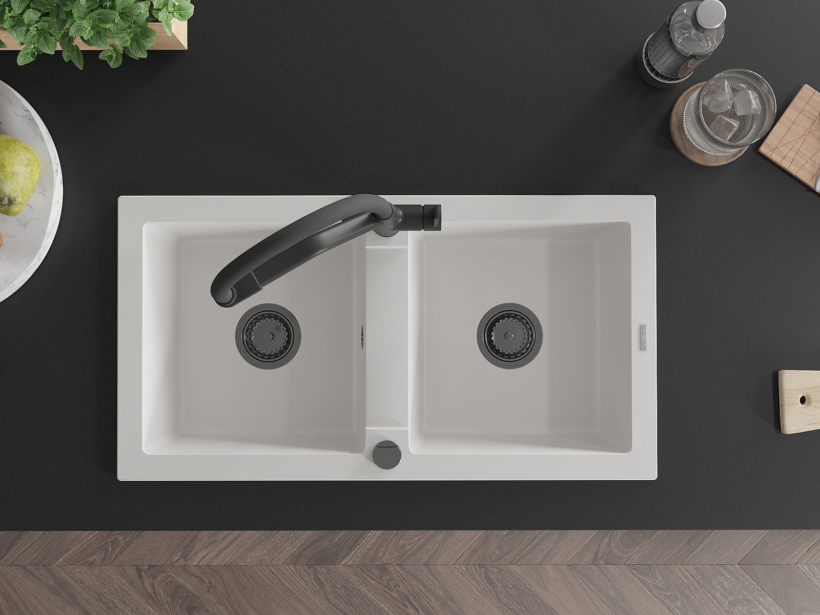 Mexen Mario granitový dřez 2-komorový s kuchyňskou baterií Duo, bílý - 6504-20-671701-70-B