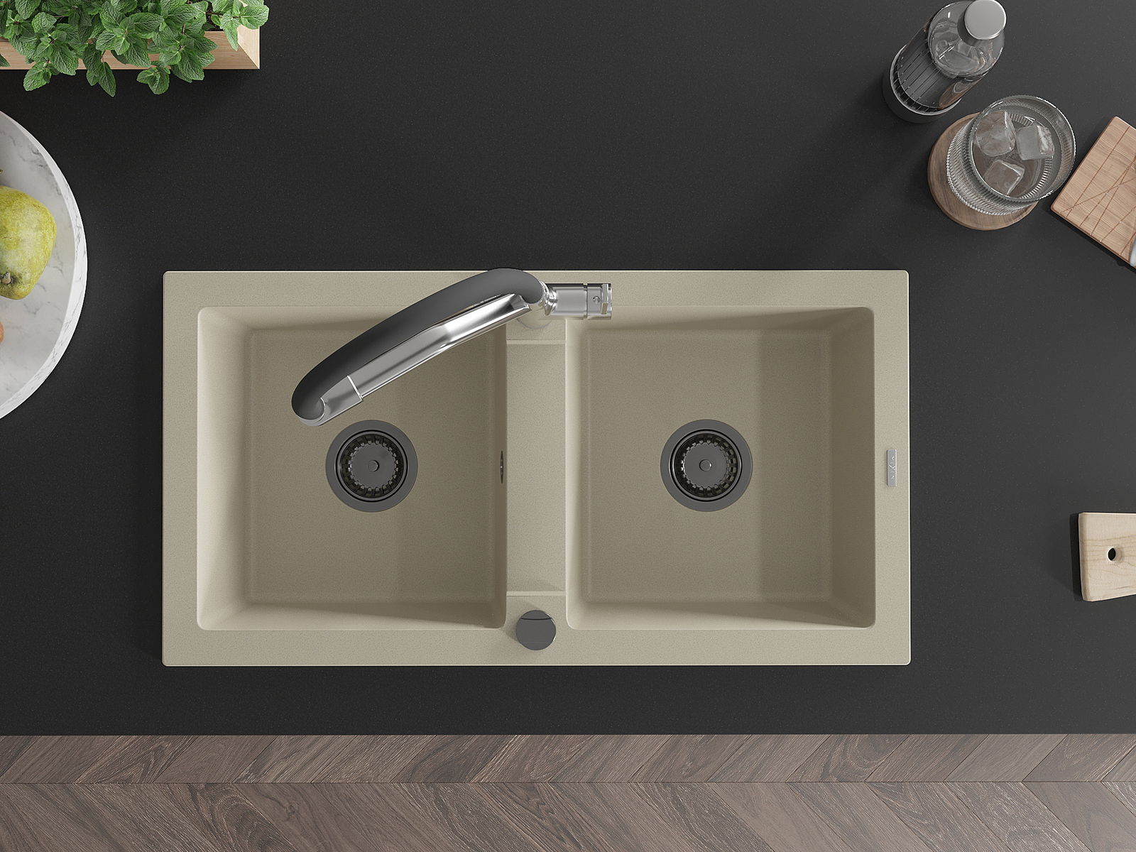 Mexen Mario žulový dřez 2-komorový s kuchyňskou baterií Duo, béžový - 6504-69-671701-07-B