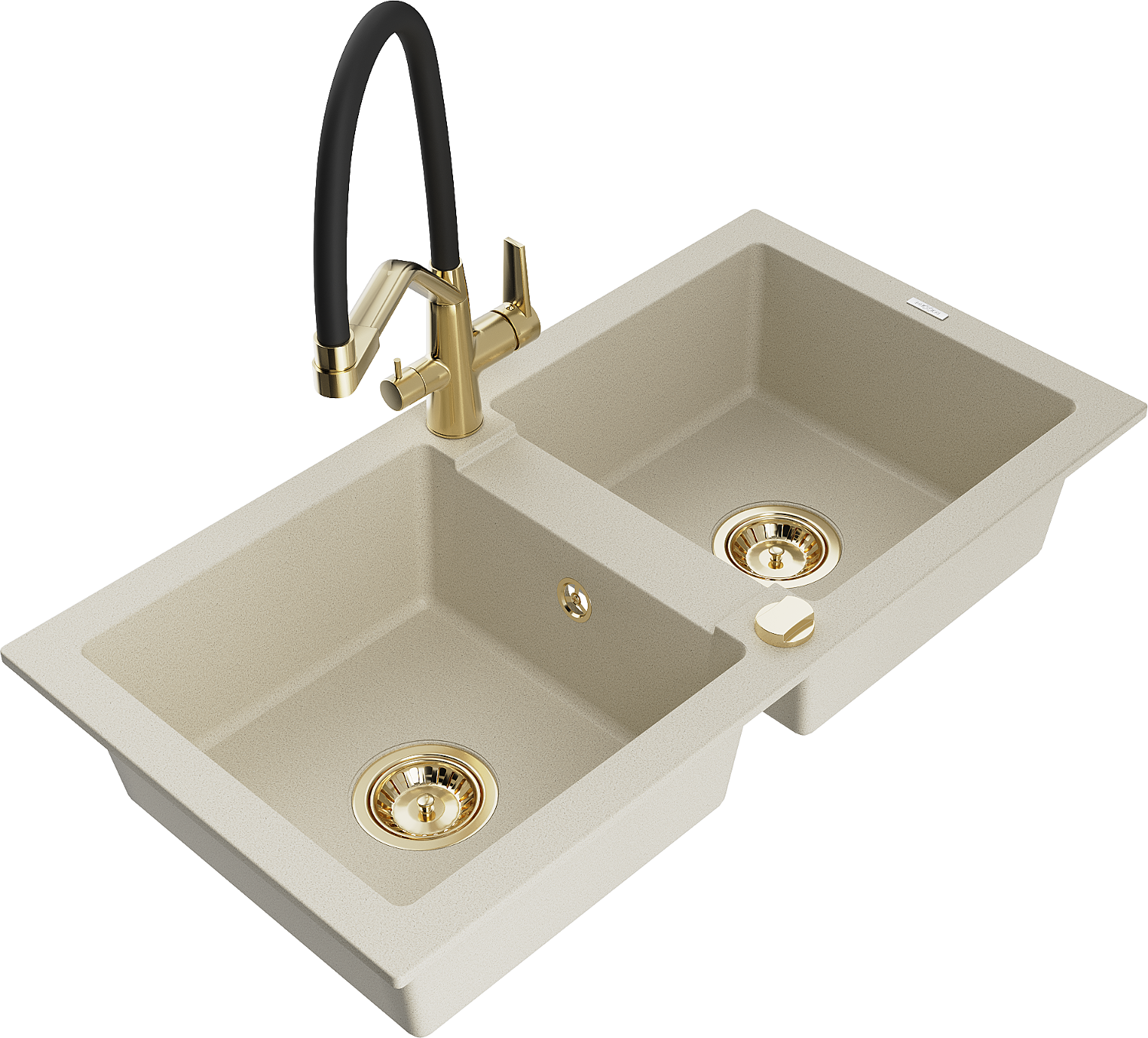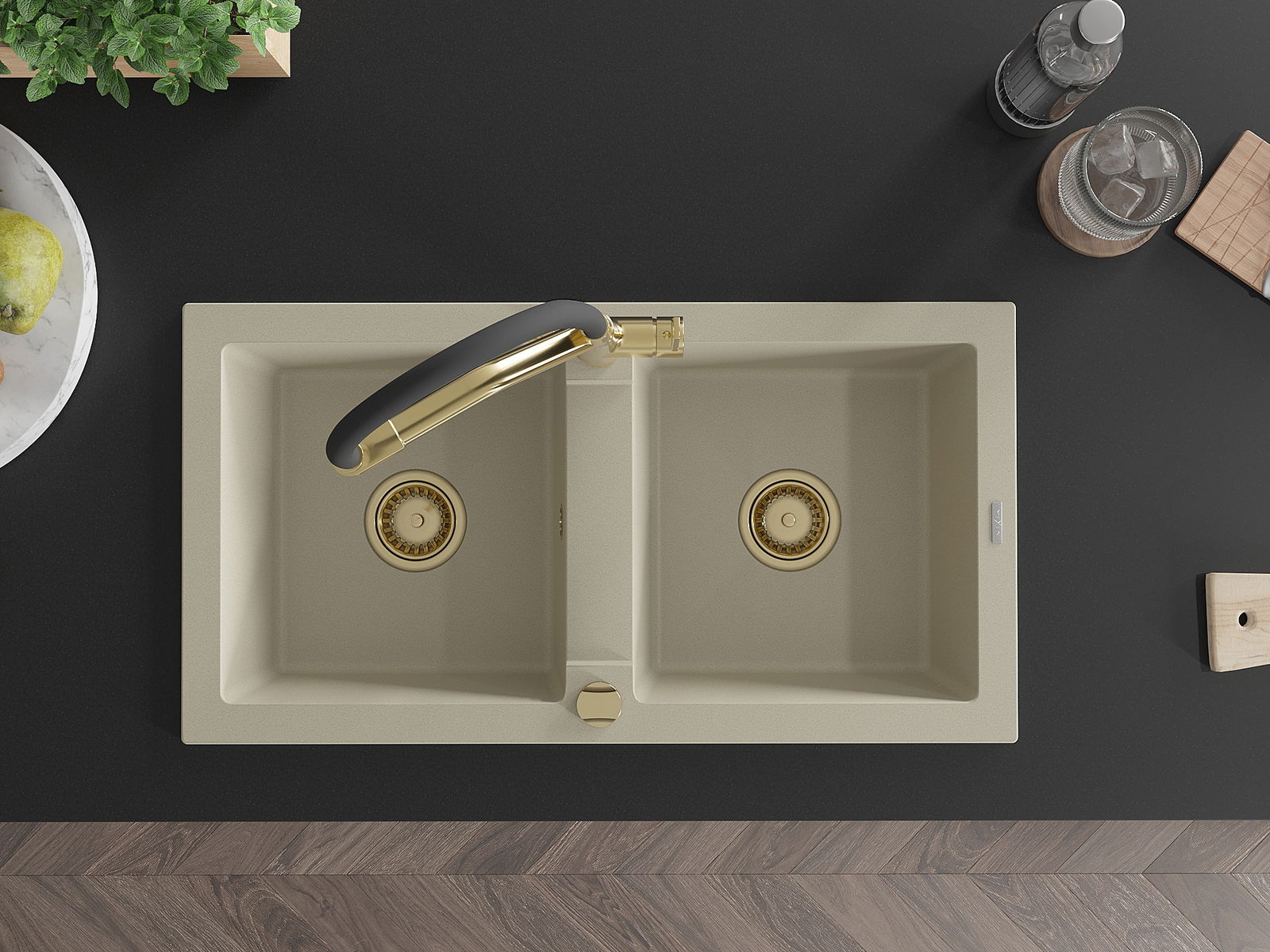 Mexen Mario granitový kuchyňský dřez 2-komorový s kuchyňskou baterií Duo, béžový - 6504-69-671701-57-G