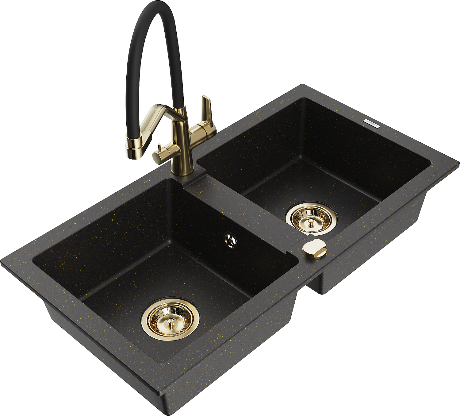 Mexen Mario granitový dřez 2-komorový s kuchyňskou baterií Duo, černý/zlatý metalický - 6504-75-671701-57-G