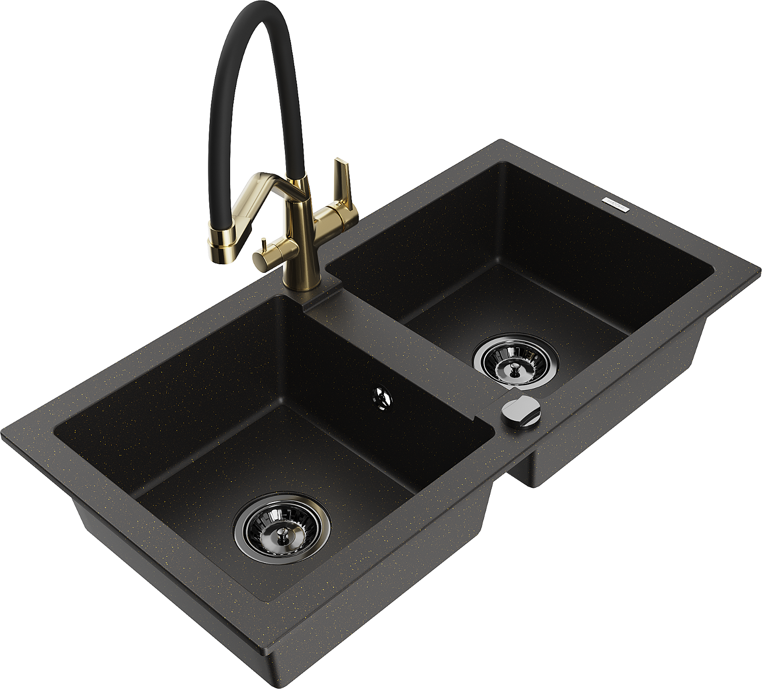 Mexen Mario granitový dřez 2-komorový s kuchyňskou baterií Duo, černý/zlatý metalik - 6504-75-671701-57-B