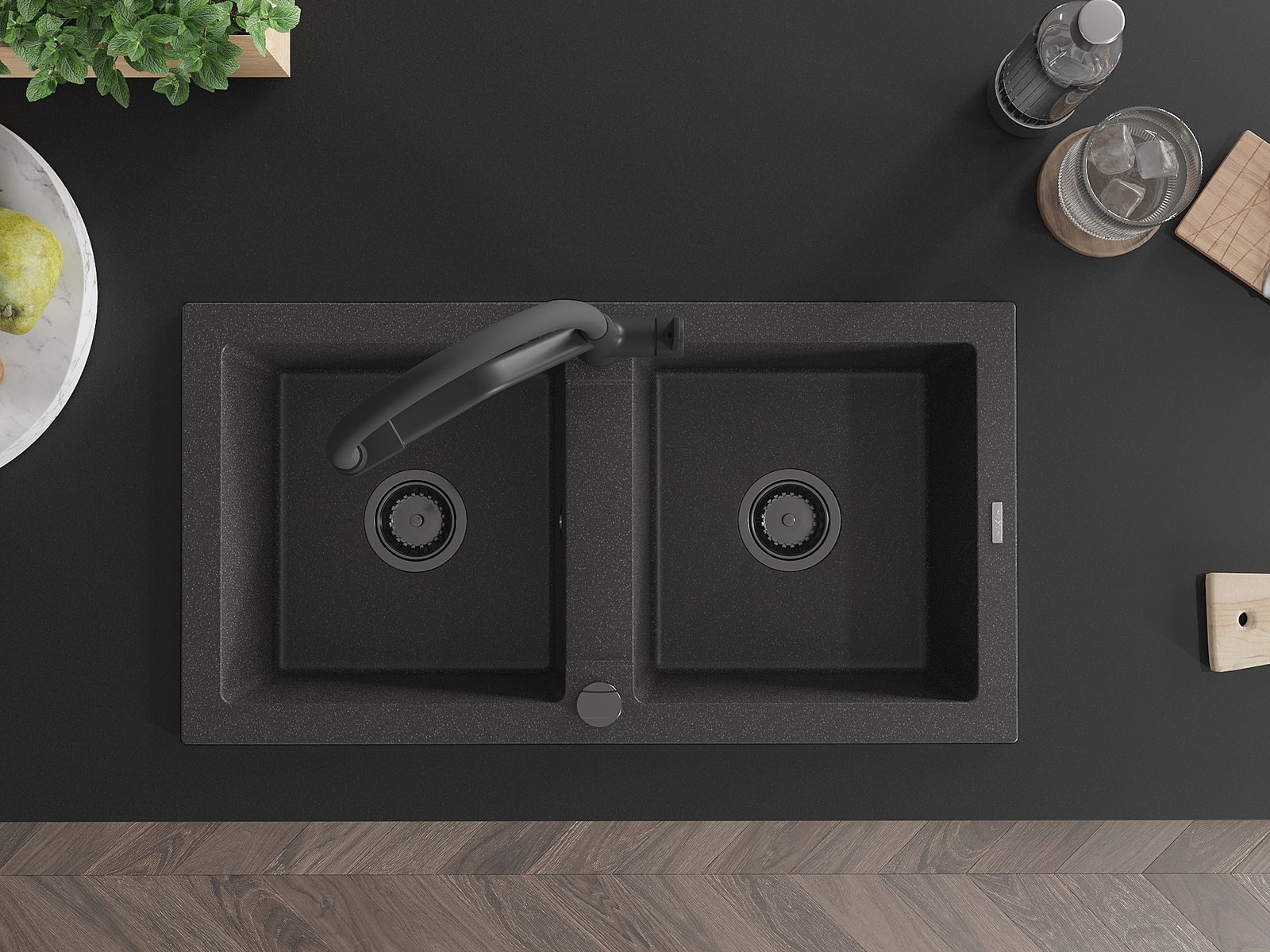 Mexen Mario granitový dřez 2-komorový s kuchyňskou baterií Duo, černý skvrnitý - 6504-76-671701-70-B