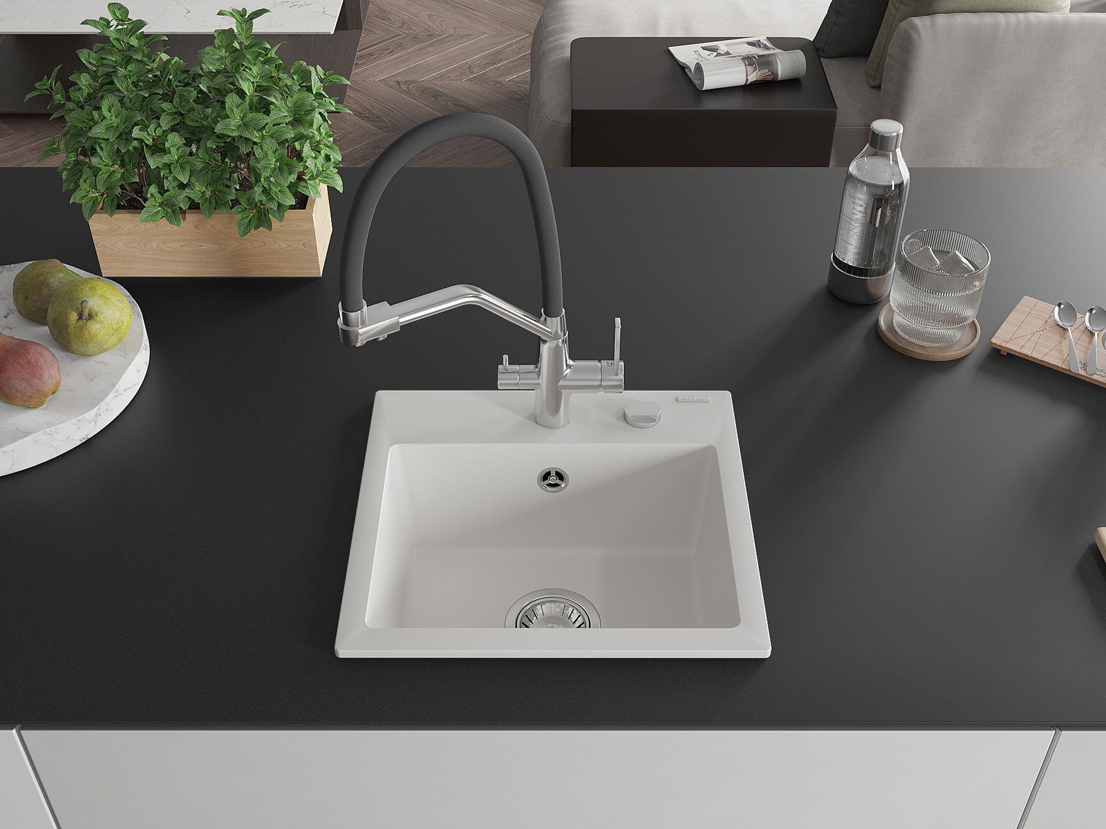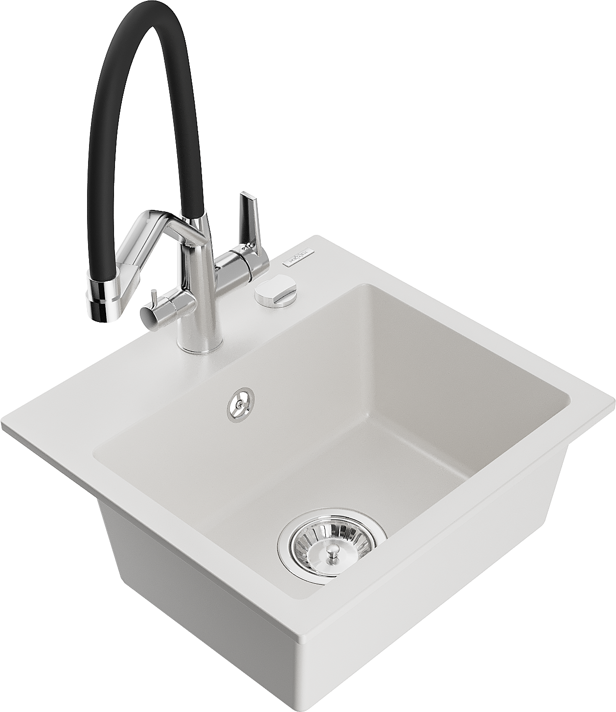 Mexen Milo granitový dřez 1-komorový s kuchyňskou baterií Duo, bílý - 6505-20-671701-07