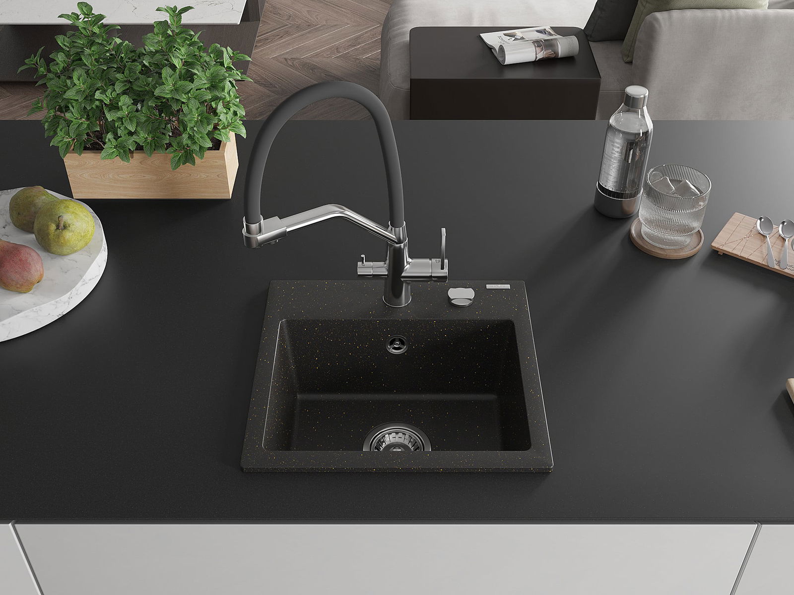 Dřez má předfrézovaný otvor o průměru 35 mm k samostatnému proražení. Může být použit například k montáži dávkovače na tekutinu, který eliminuje přítomnost plastových lahví v kuchyni a dodá jí elegantní finiš.