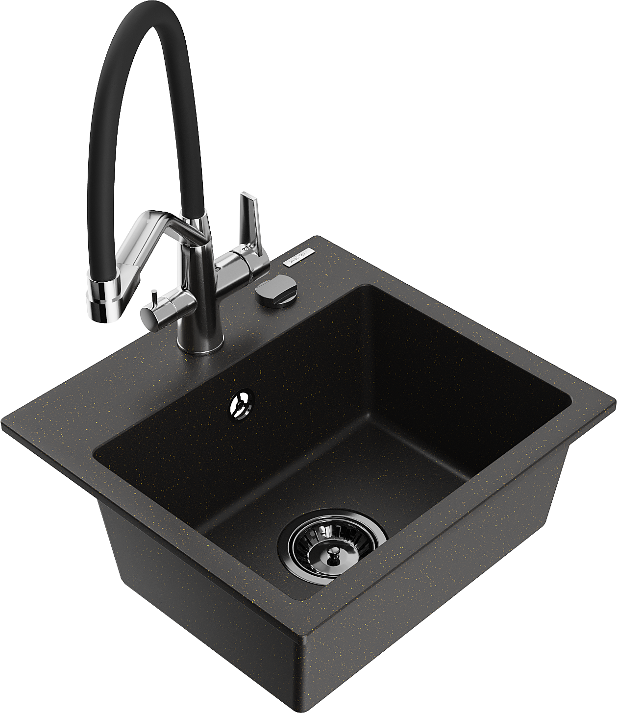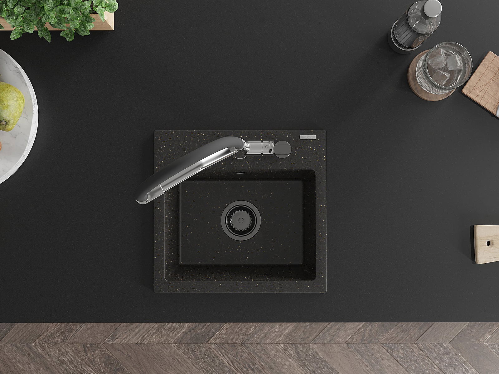 Mexen Milo granitový dřez 1-komorový s kuchyňskou baterií Duo, černá/zlatý metalík - 6505-75-671701-07-B