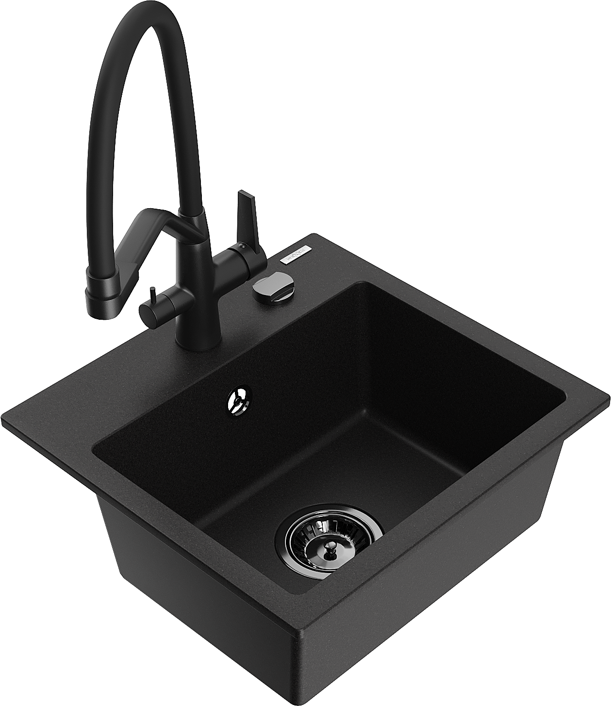 Mexen Milo granitový dřez s 1 komorou a kuchyňskou baterií Duo, černý - 6505-77-671701-70-B
