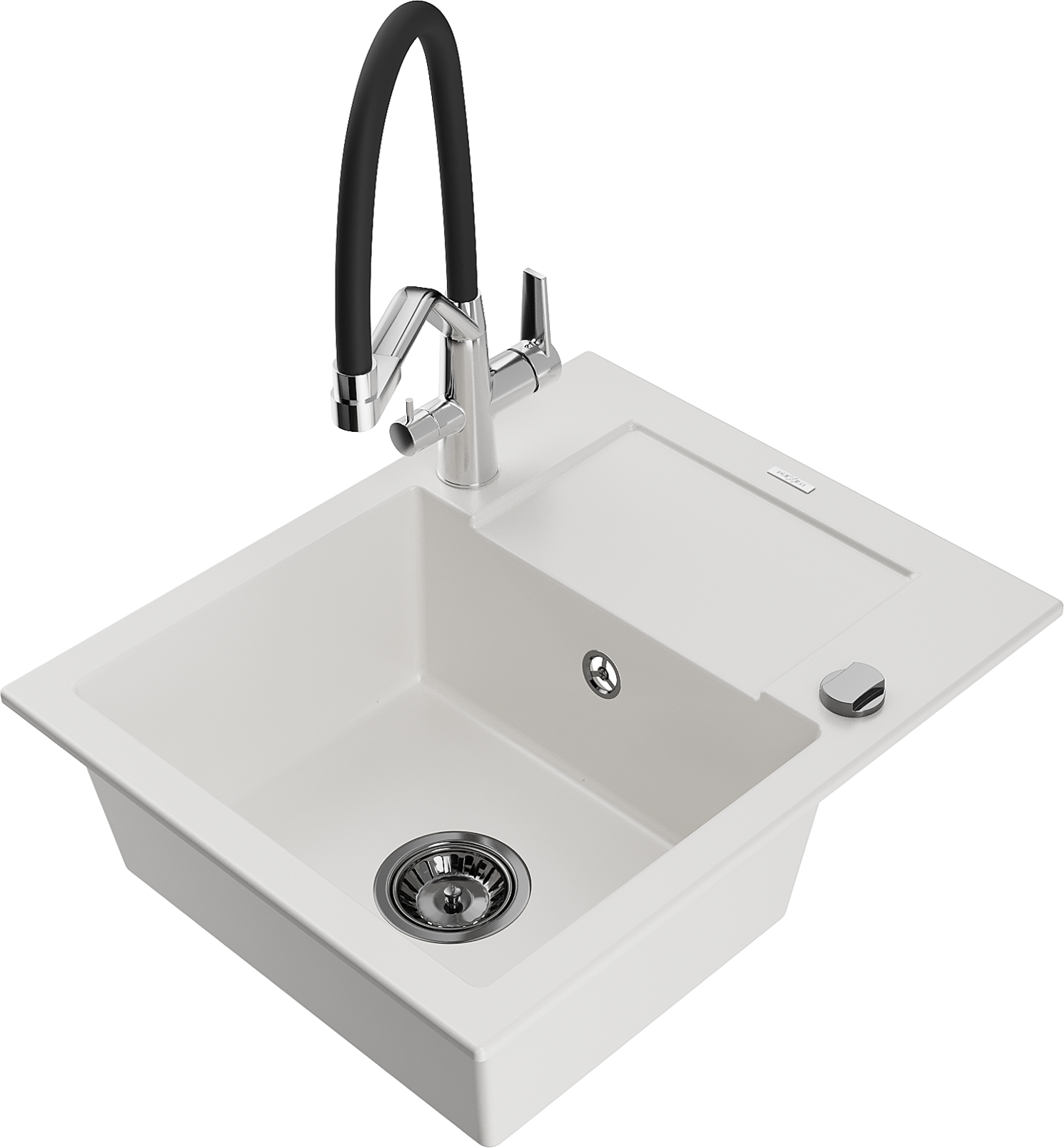 Mexen Enzo granitový dřez 1-komorový s odkapávačem a kuchyňskou baterií Duo, bílý - 6506-20-671701-07-B