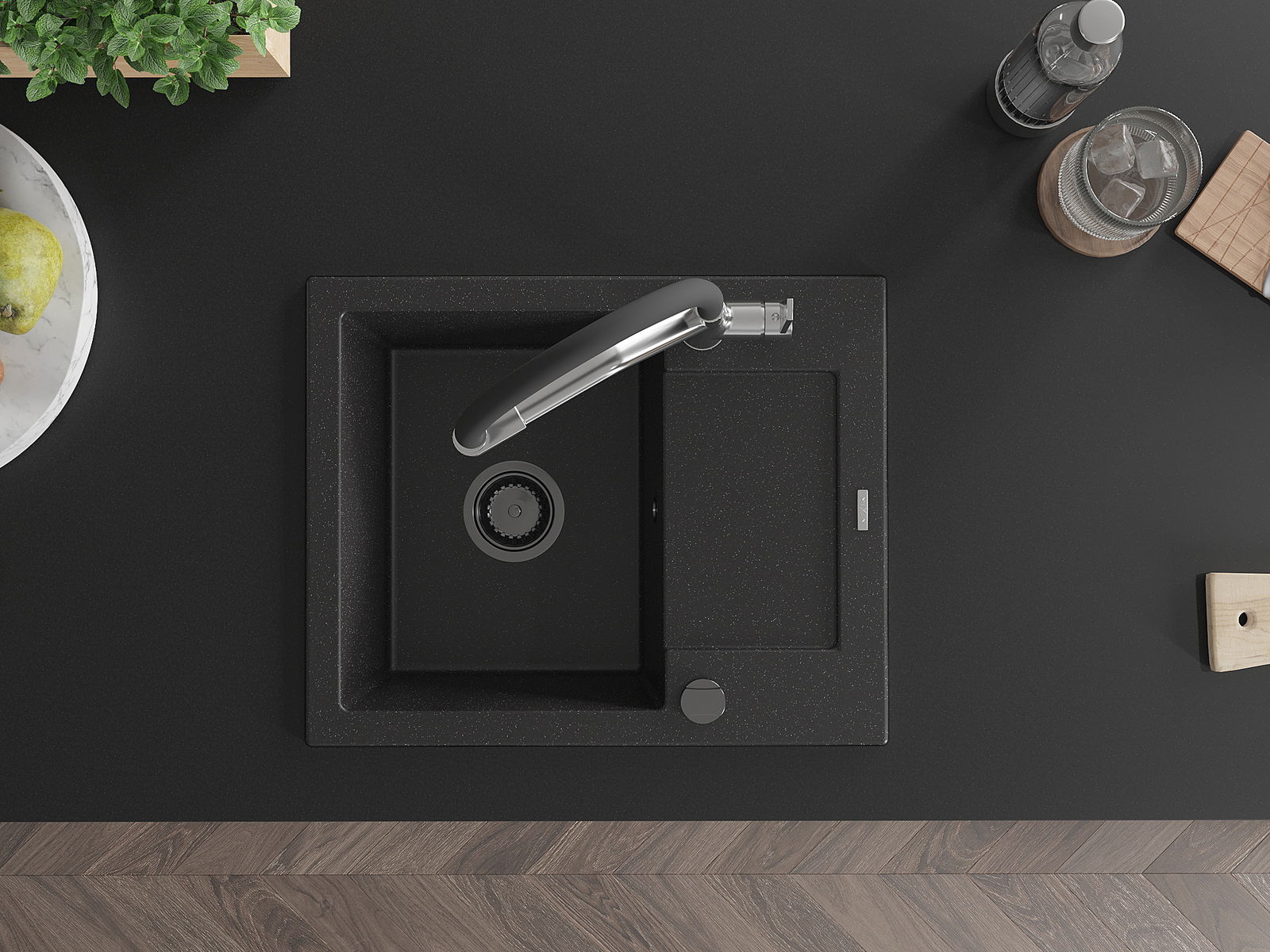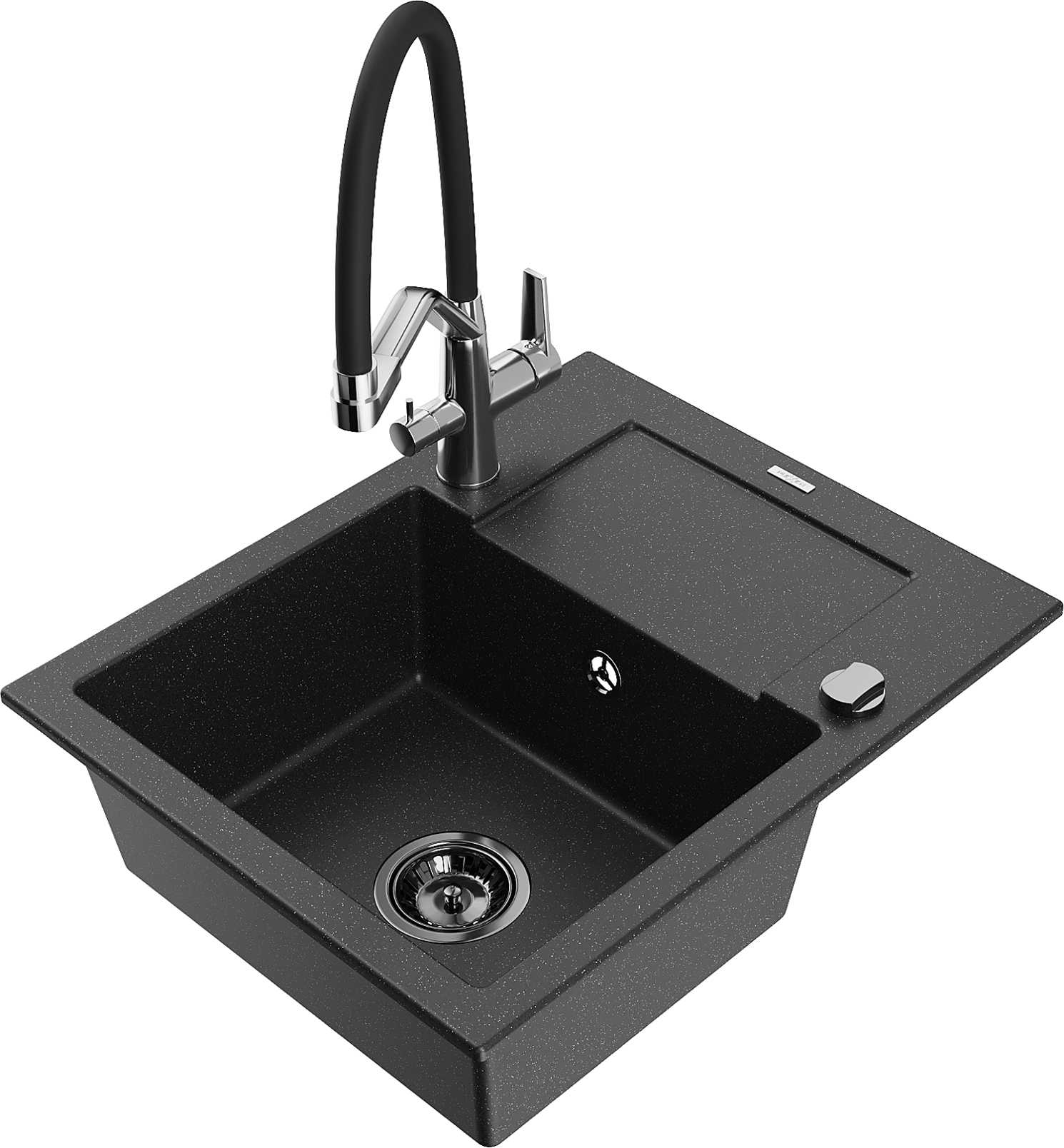 Mexen Enzo žulový dřez s 1 komorou s odkapávačem a kuchyňskou baterií Duo, černý/stříbrný metalický - 6506-73-671701-07-B