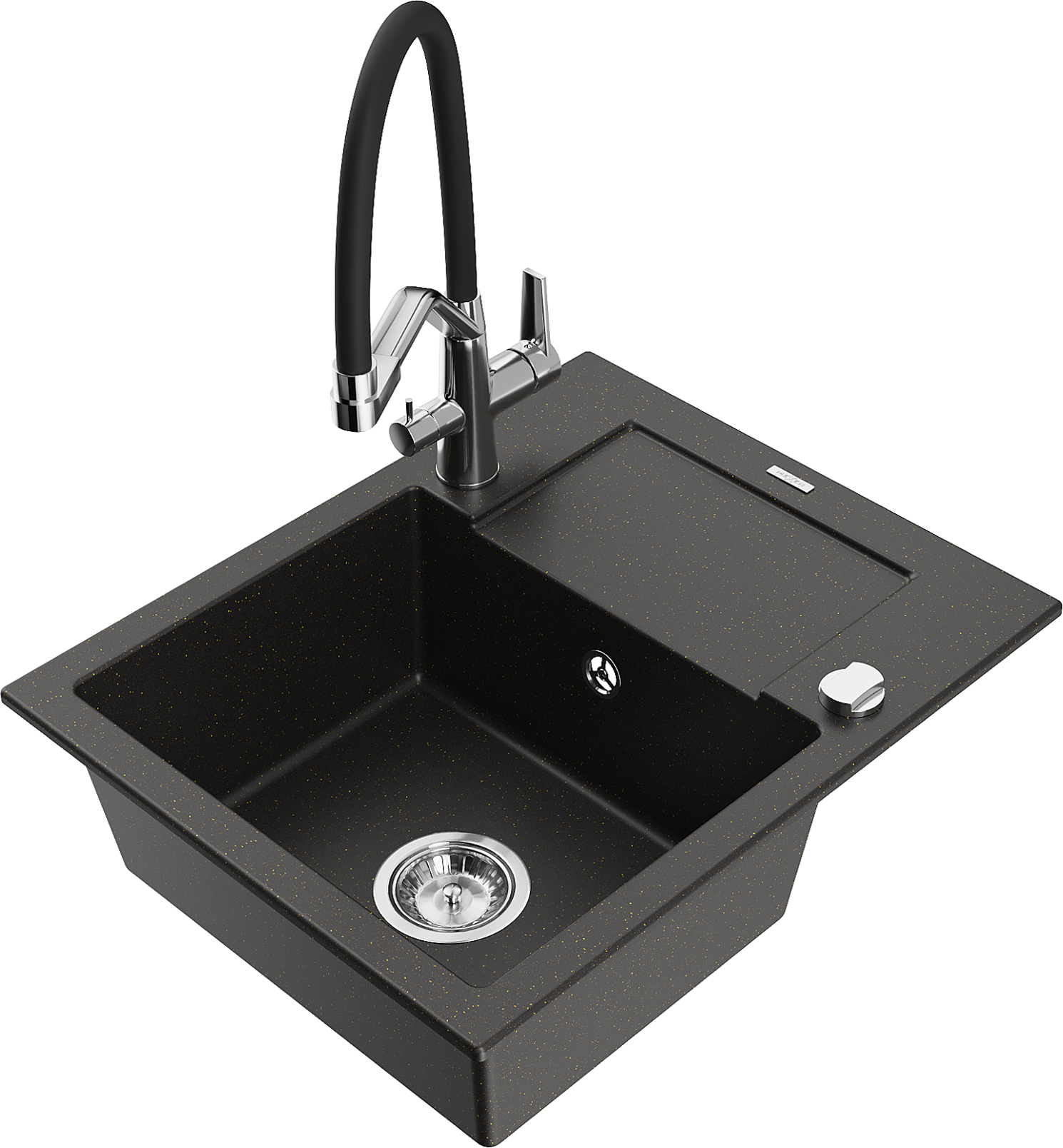 Mexen Enzo granitový dřez 1-komorový s odkapávačem a kuchyňskou baterií Duo, černý/zlatý metalik - 6506-75-671701-07