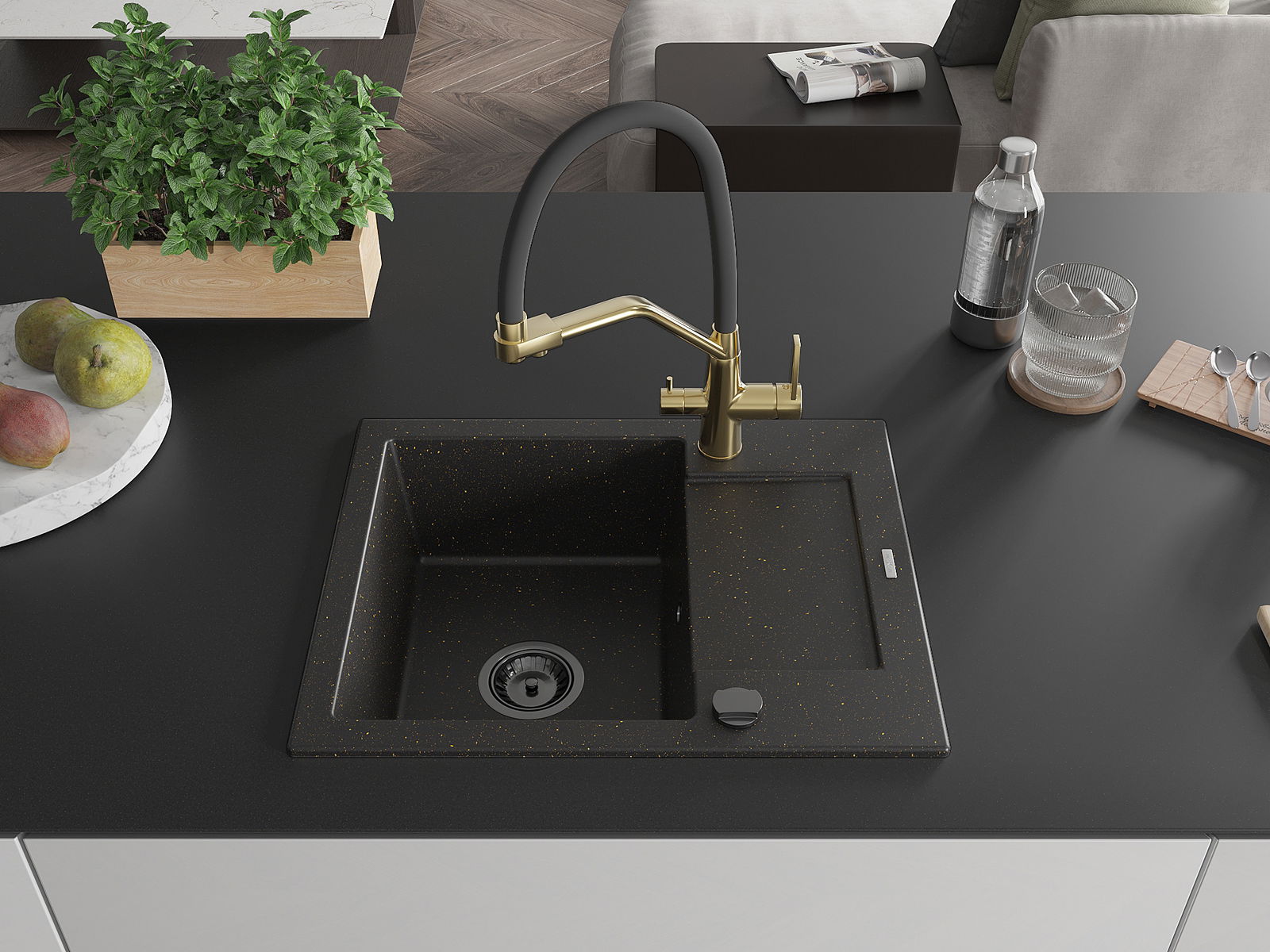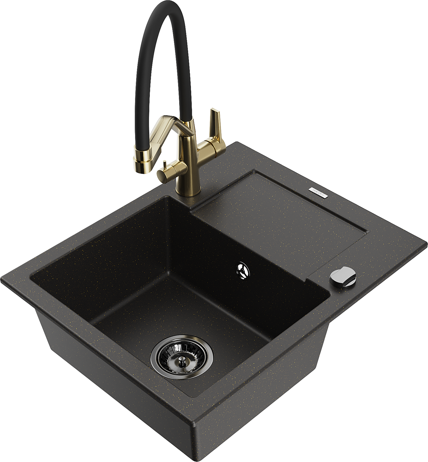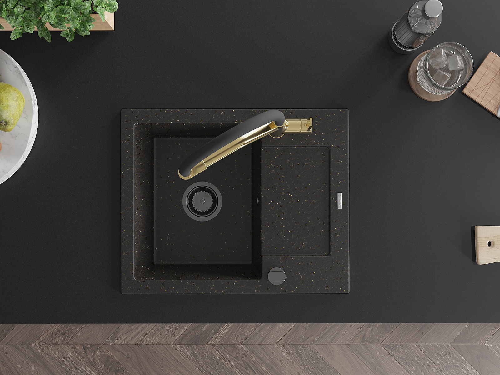 Mexen Enzo granitový dřez 1-komorový s odkapávačem a kuchyňskou baterií Duo, černý/zlatý metalik - 6506-75-671701-57-B