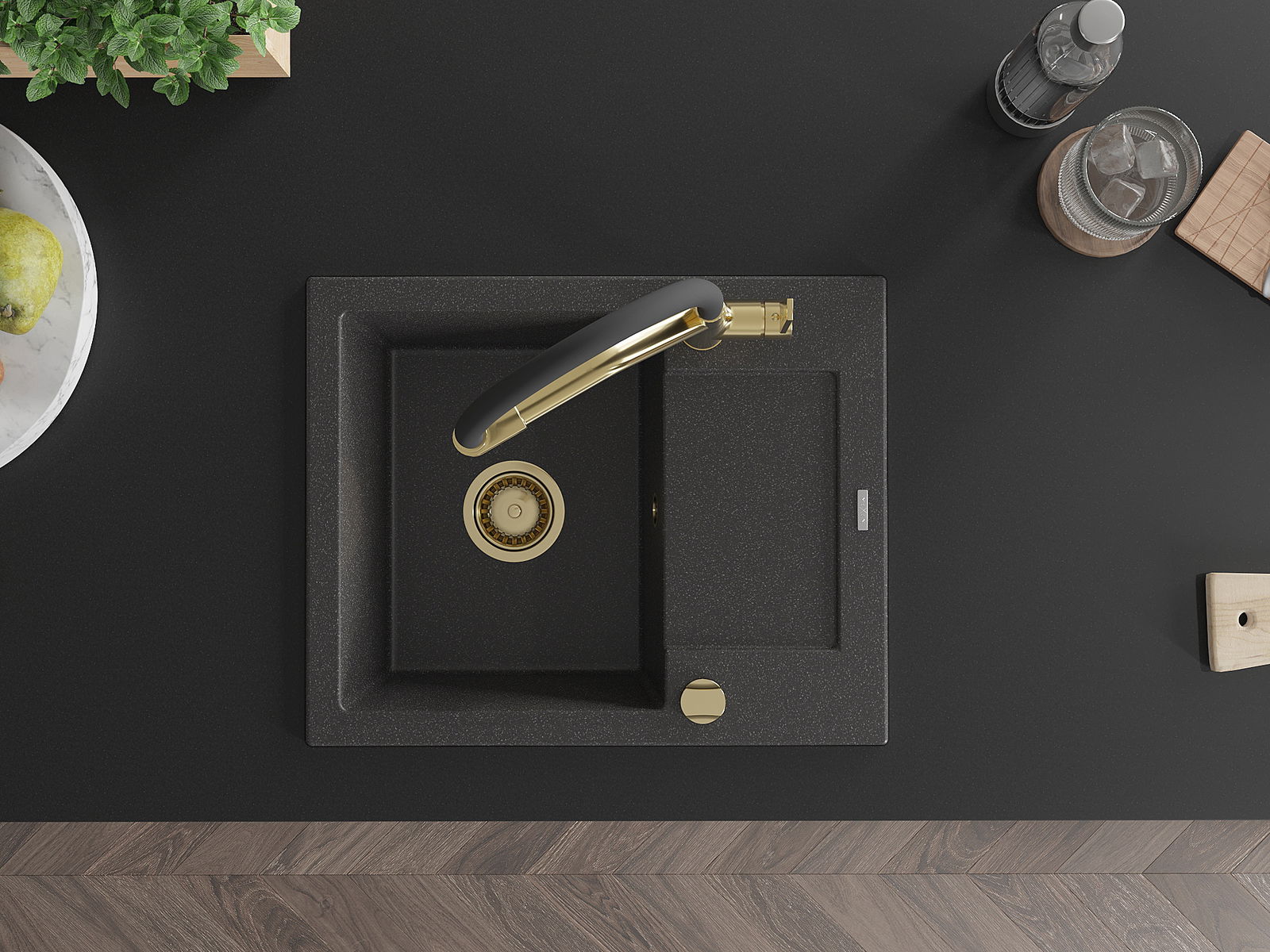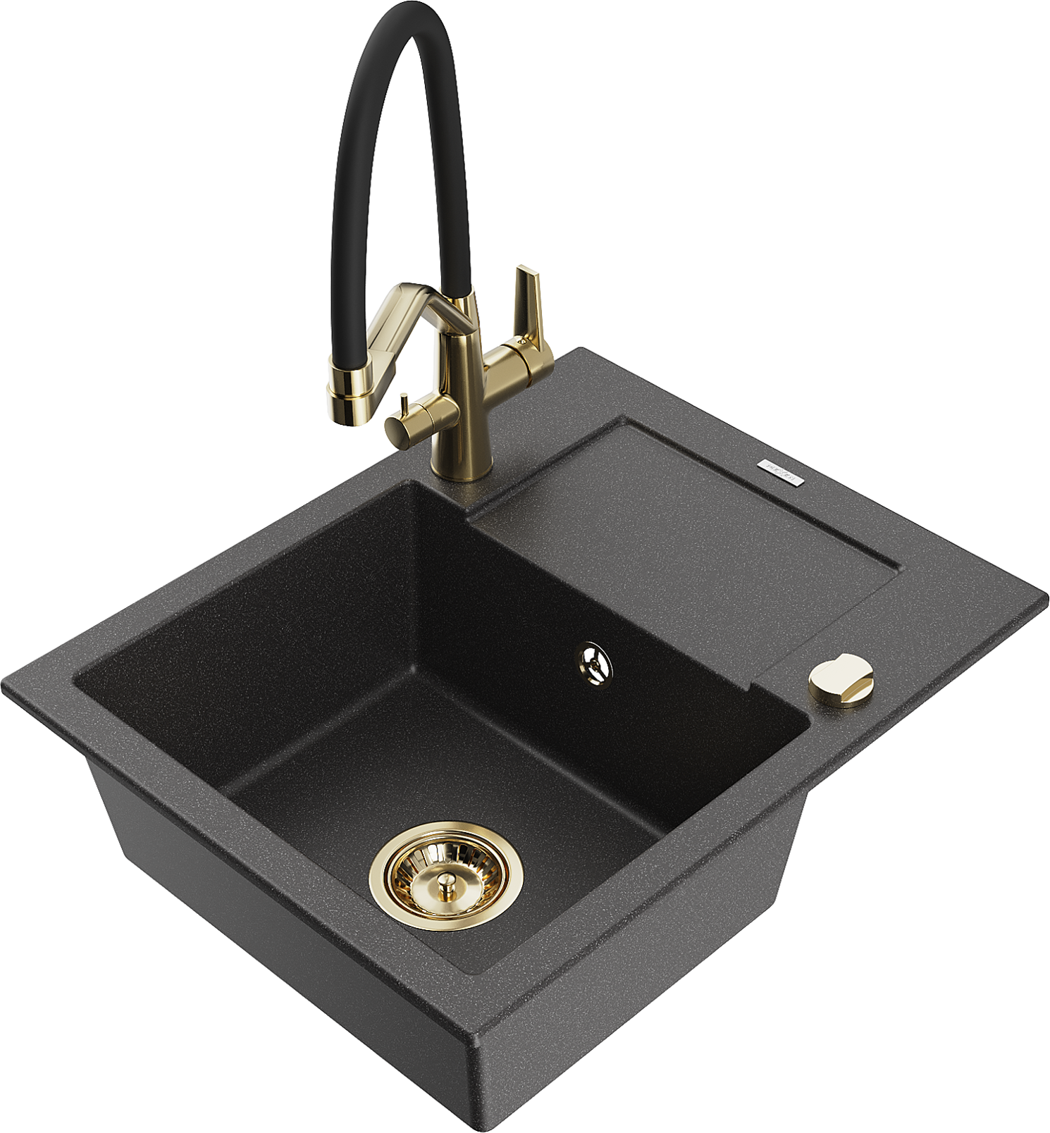 Mexen Enzo granitový dřez 1-komorový s odkapávačem a kuchyňskou baterií Duo, černý skvrnitý - 6506-76-671701-57-G
