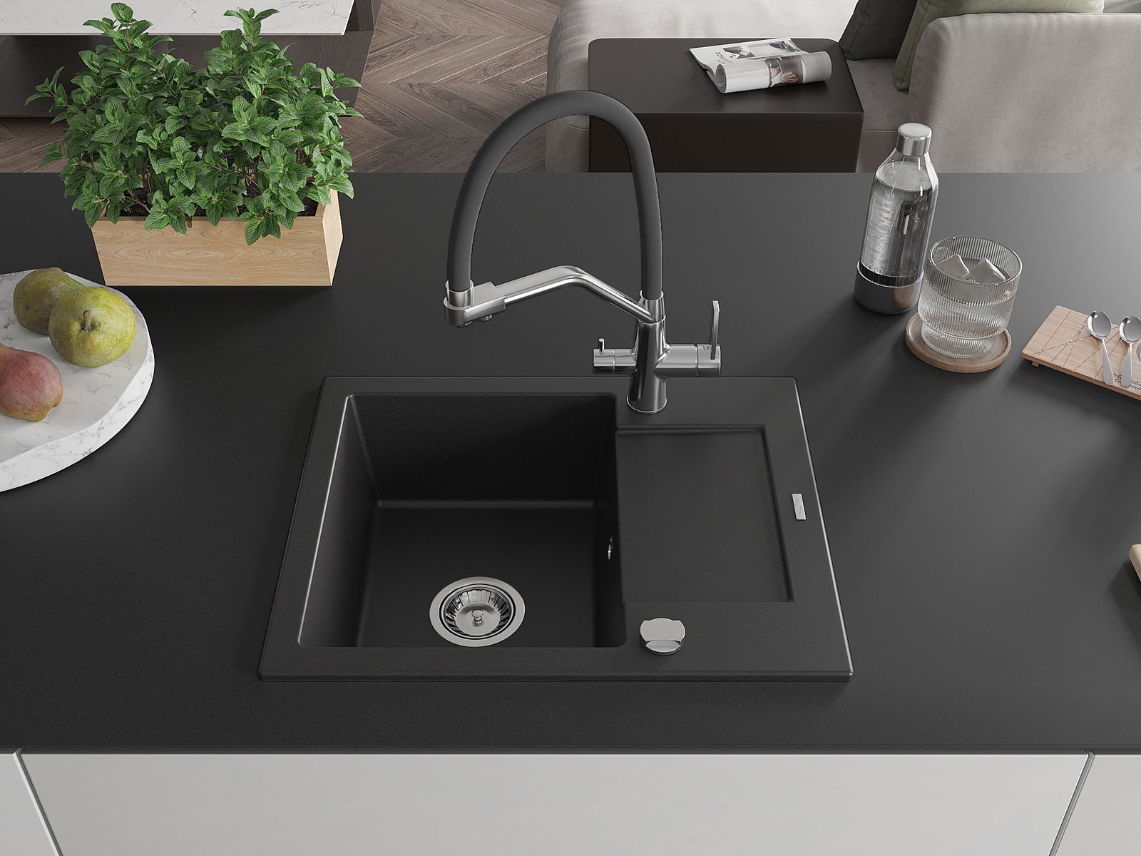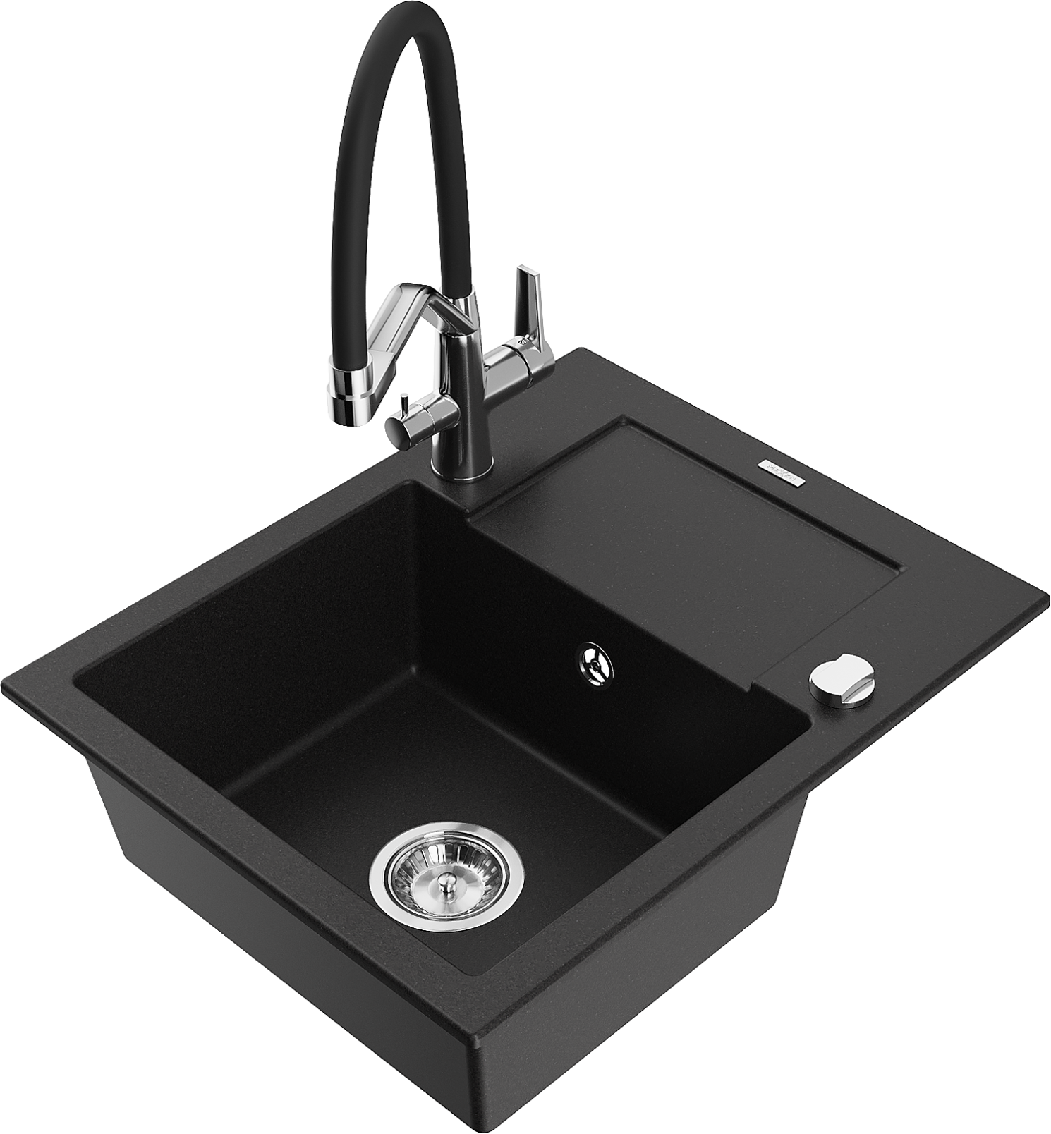 Mexen Enzo granitový dřez s 1 komorou a odkapávačem a kuchyňskou baterií Duo, černý - 6506-77-671701-07
