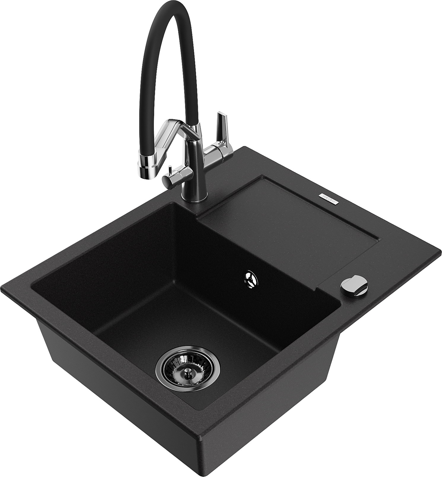 Mexen Enzo granitový dřez s 1 komorou, odkapávačem a kuchyňskou baterií Duo, černý - 6506-77-671701-07-B