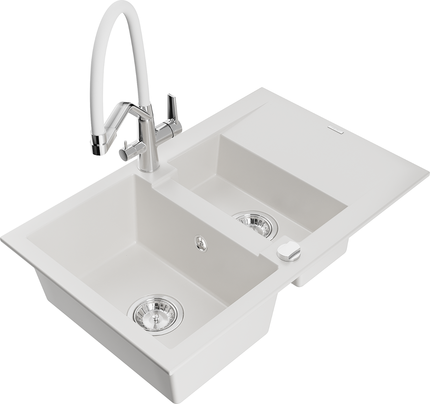 Mexen Gaspar granitový dřez 1,5-komorový s odkapávačem a kuchyňskou baterií Duo, bílý - 6507-20-671701-02