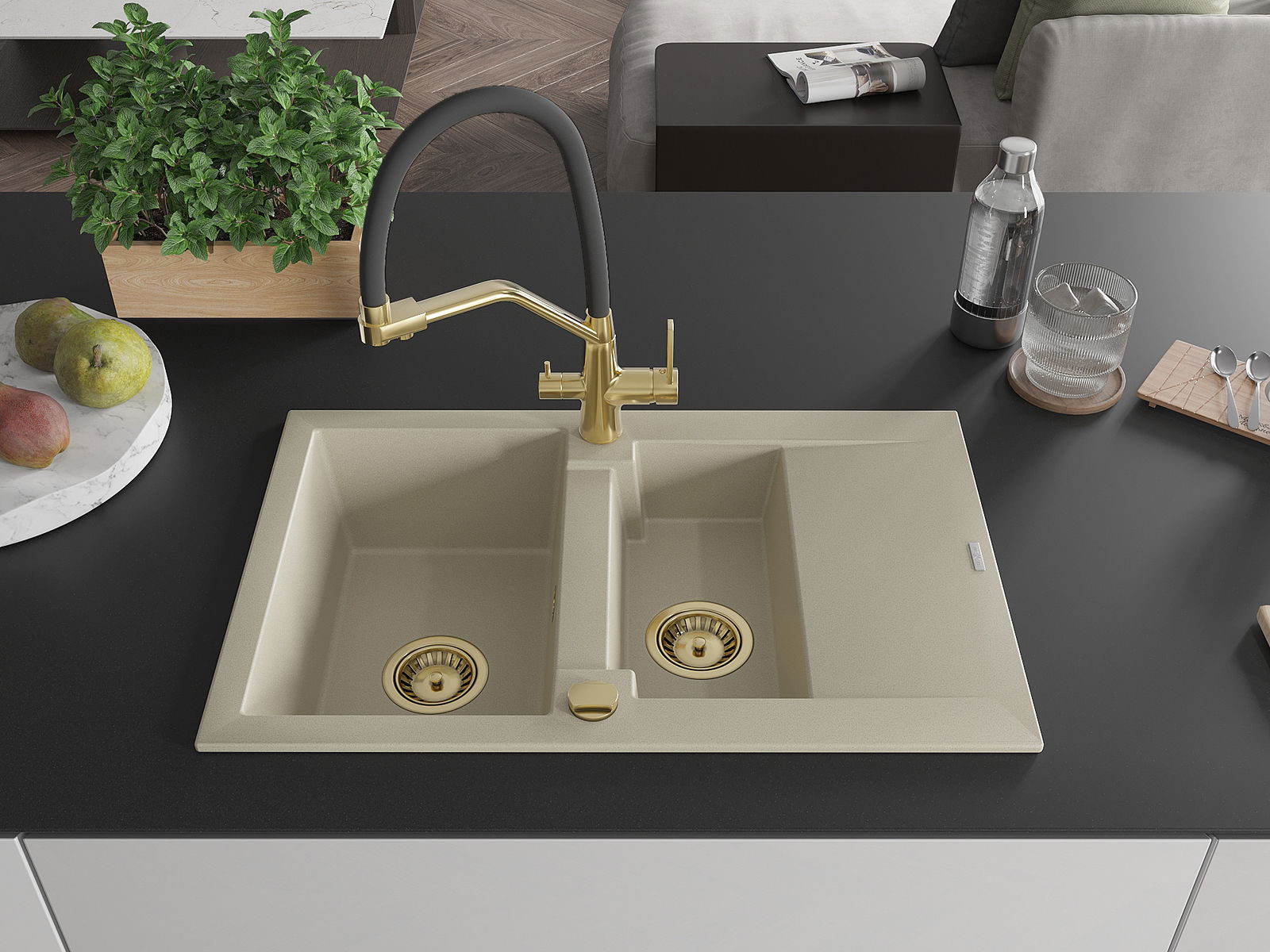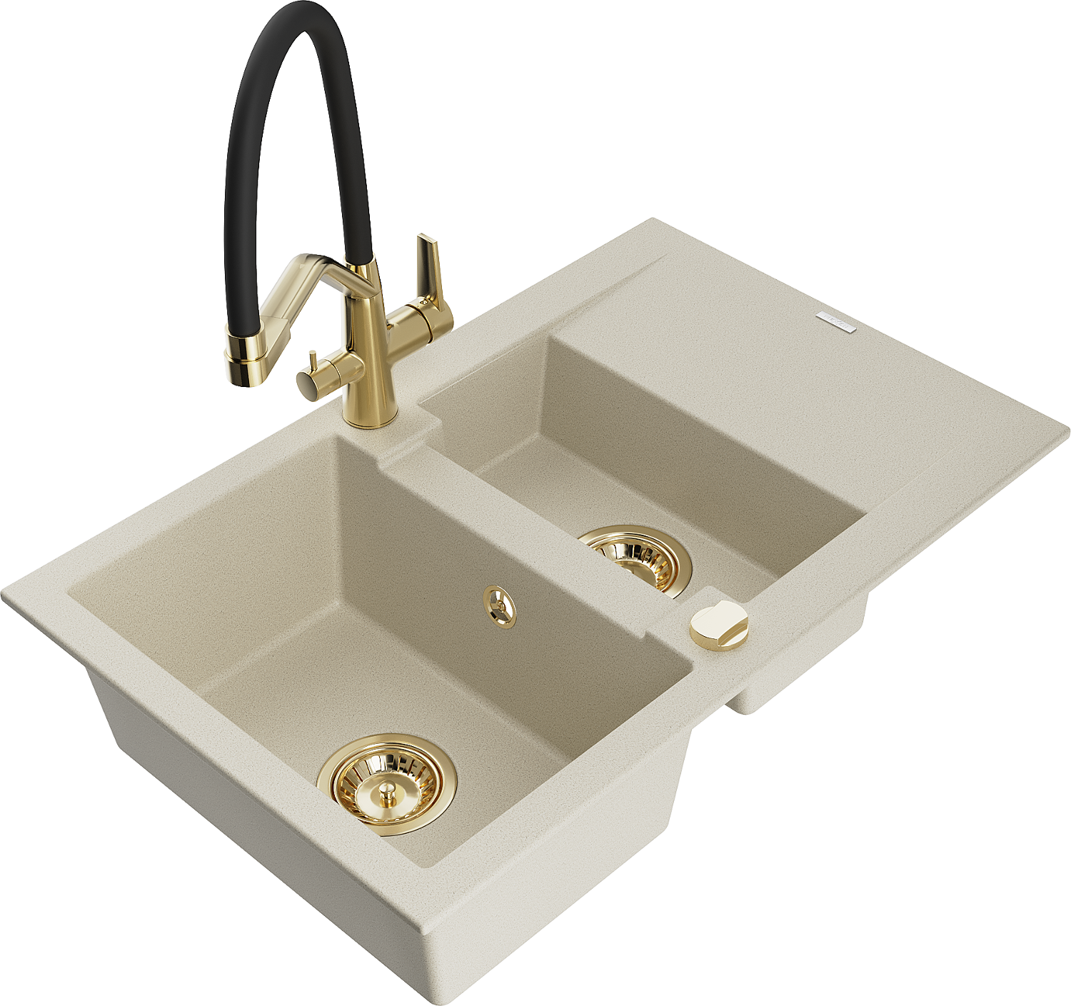 Mexen Gaspar granitový dřez 1,5-komorový s odkapávačem a kuchyňskou baterií Duo, béžový - 6507-69-671701-57-G