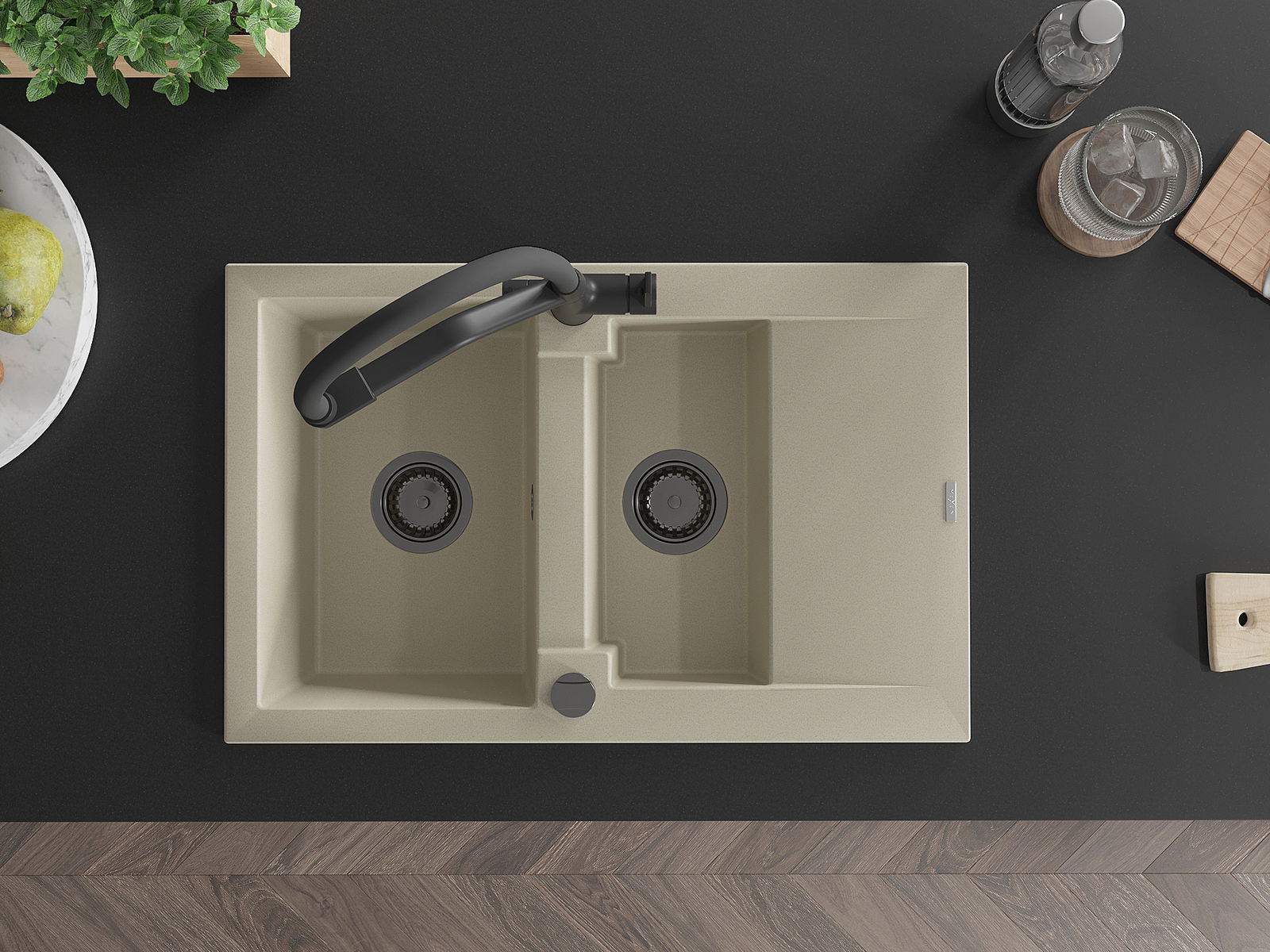 Mexen Gaspar granitový dřez 1,5-komorový s odkapávačem a kuchyňskou baterií Duo, béžový - 6507-69-671701-70-B