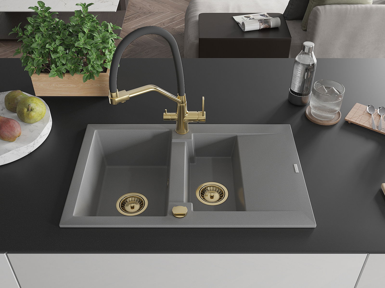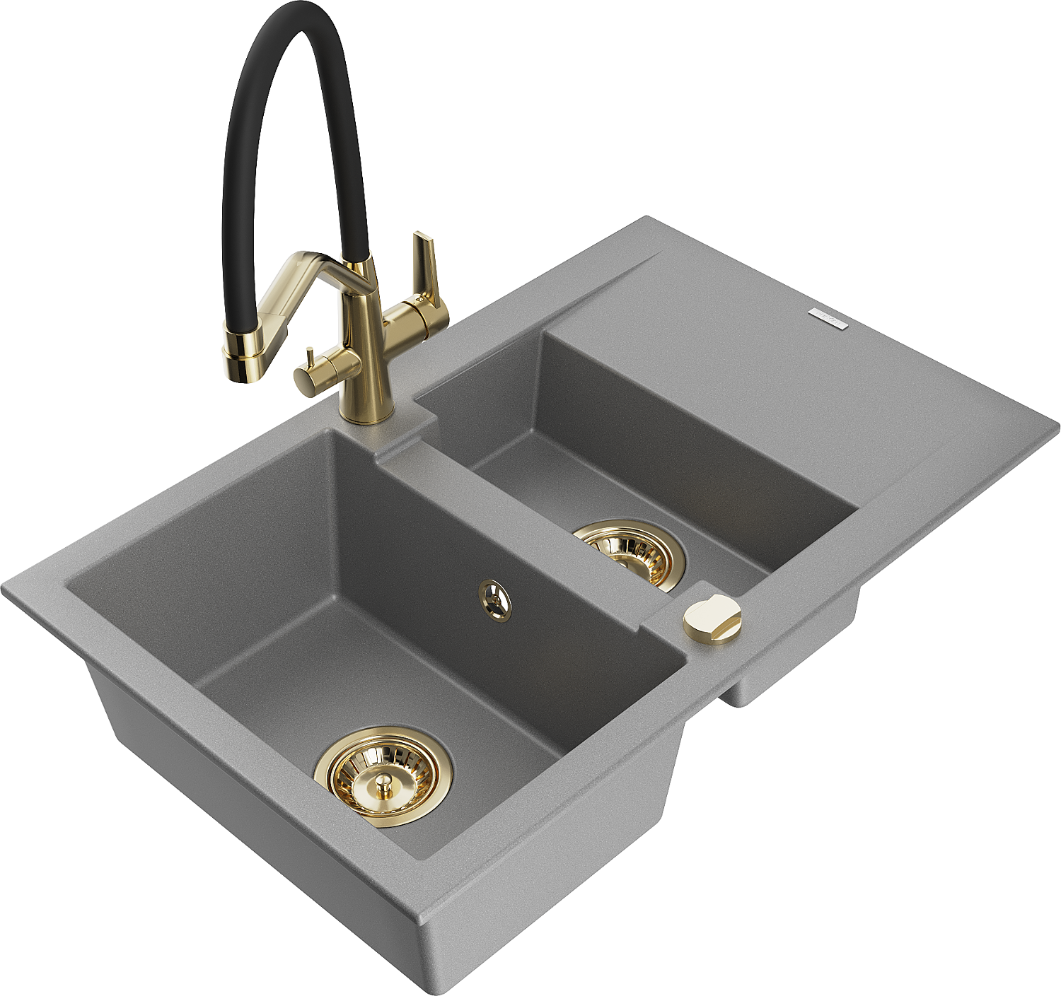 Mexen Gaspar granitový dřez 1,5-komorový s odkapávačem a kuchyňskou baterií Duo, šedý - 6507-71-671701-57-G