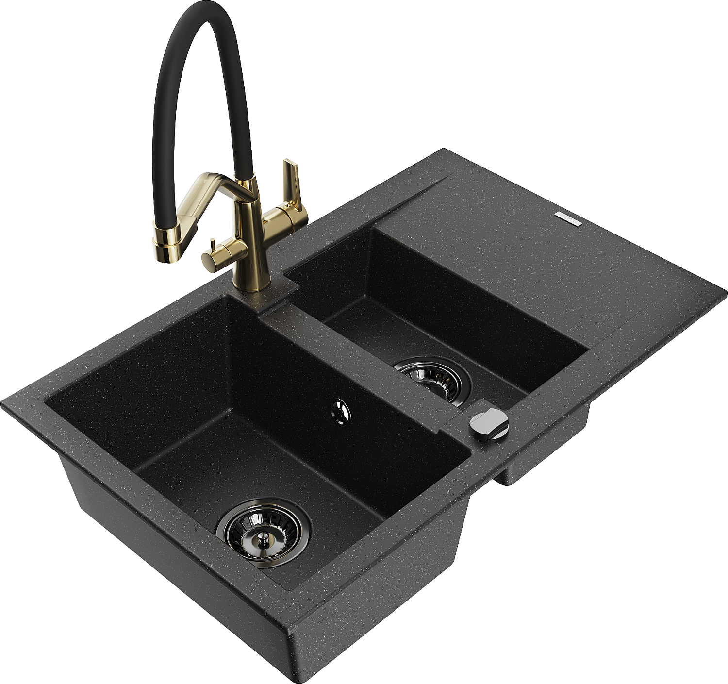 Mexen Gaspar žulový dřez 1,5-komorový s odkapávačem a kuchyňskou baterií Duo, černý/stříbrný - 6507-73-671701-57-B