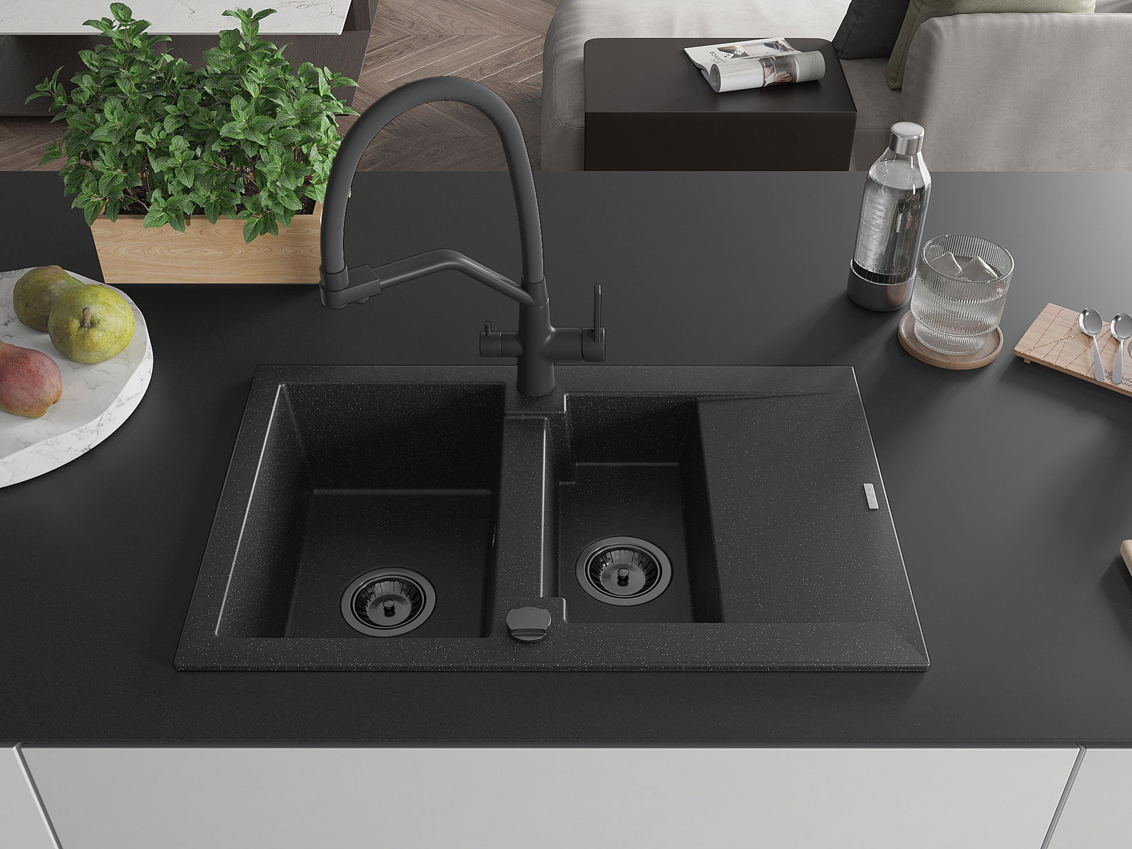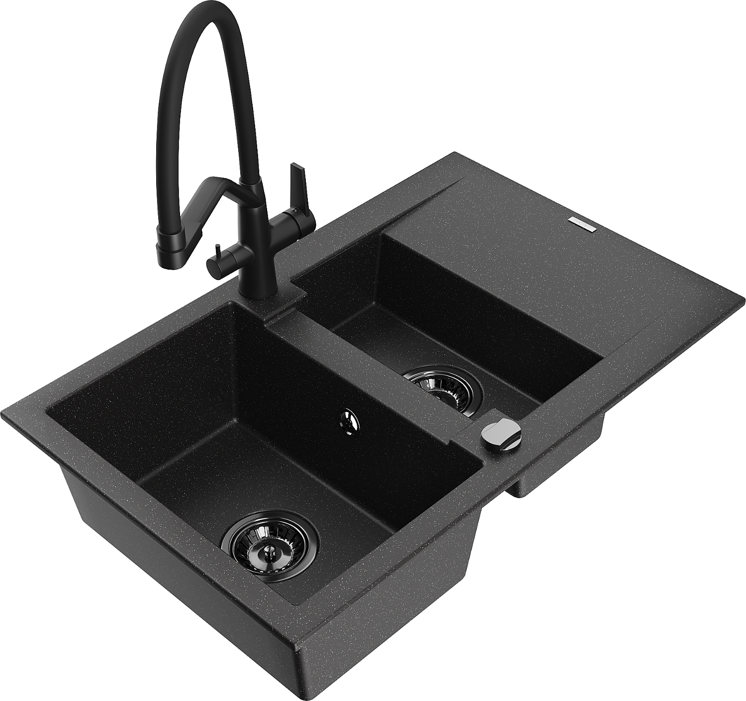 Mexen Gaspar granitový dřez 1,5-komorový s odkapávačem a kuchyňskou baterií Duo, černý/stříbrný - 6507-73-671701-70-B