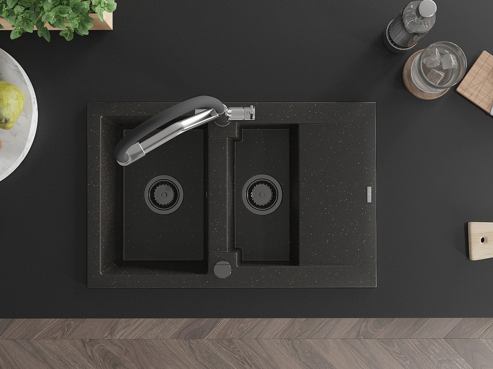 Mexen Gaspar žulový dřez 1,5-komorový s odkapávačem a kuchyňskou baterií Duo, černý/zlatý metalik - 6507-75-671701-07-B