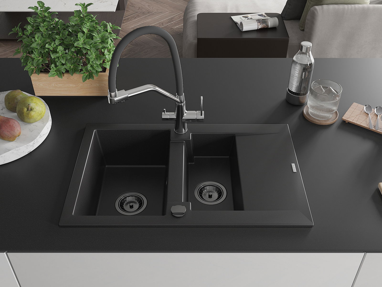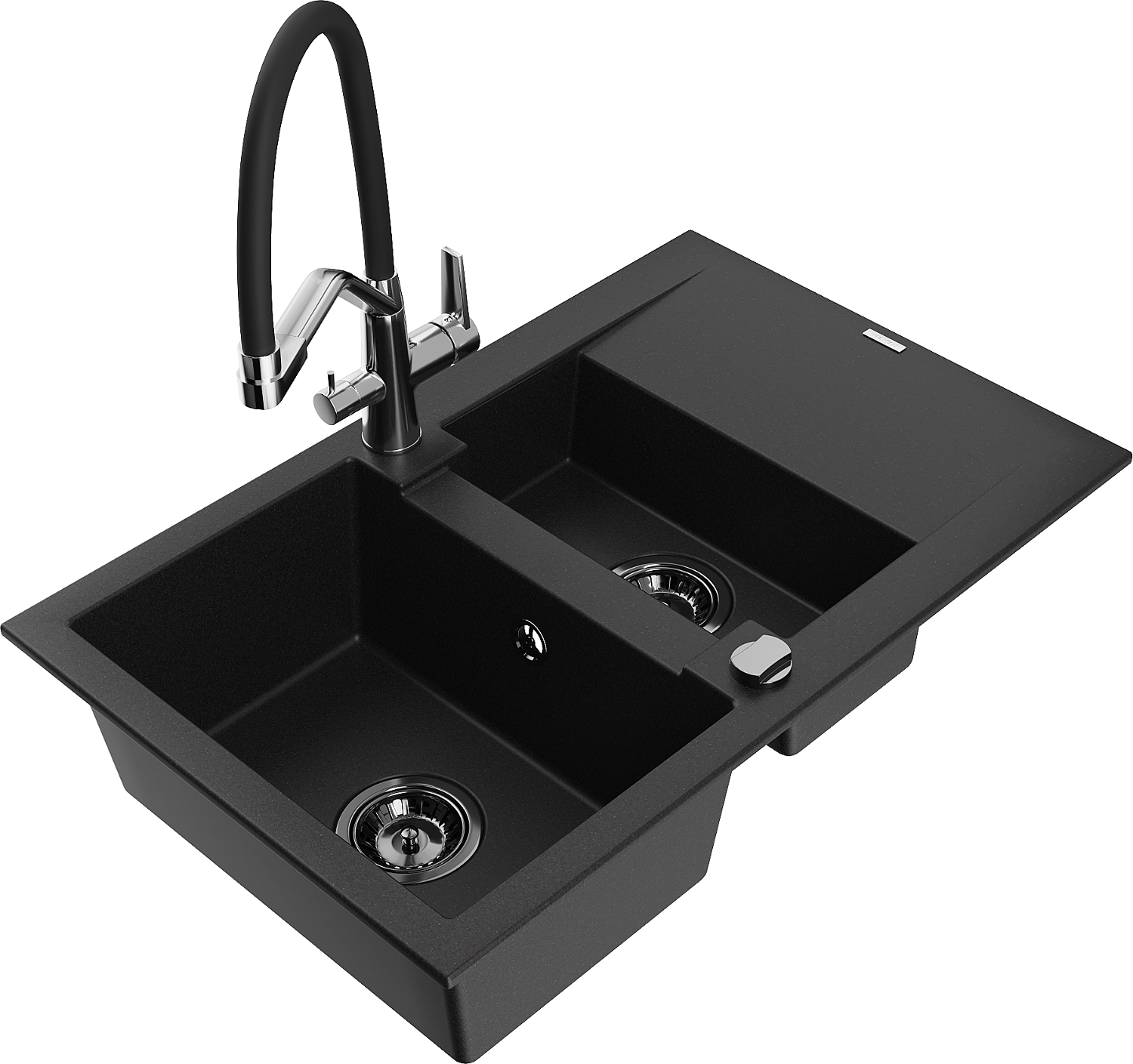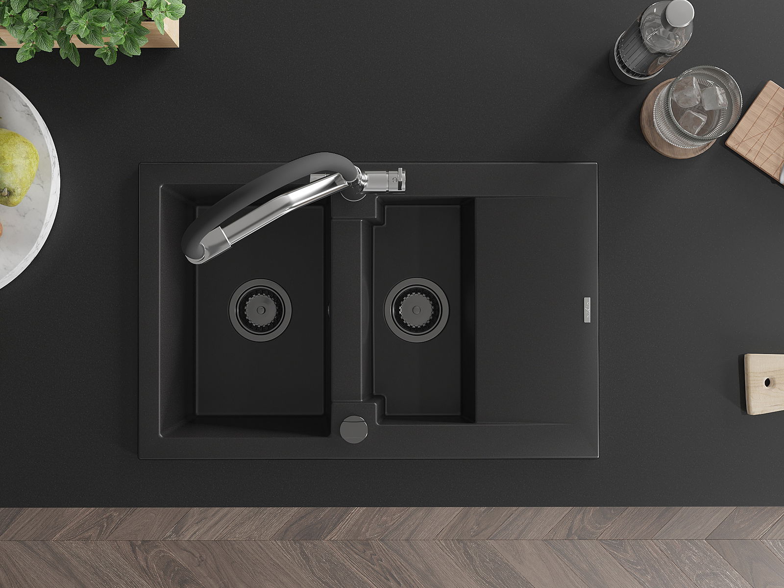 Mexen Gaspar granitový dřez 1,5-komorový s odkapávačem a kuchyňskou baterií Duo, černý - 6507-77-671701-07-B