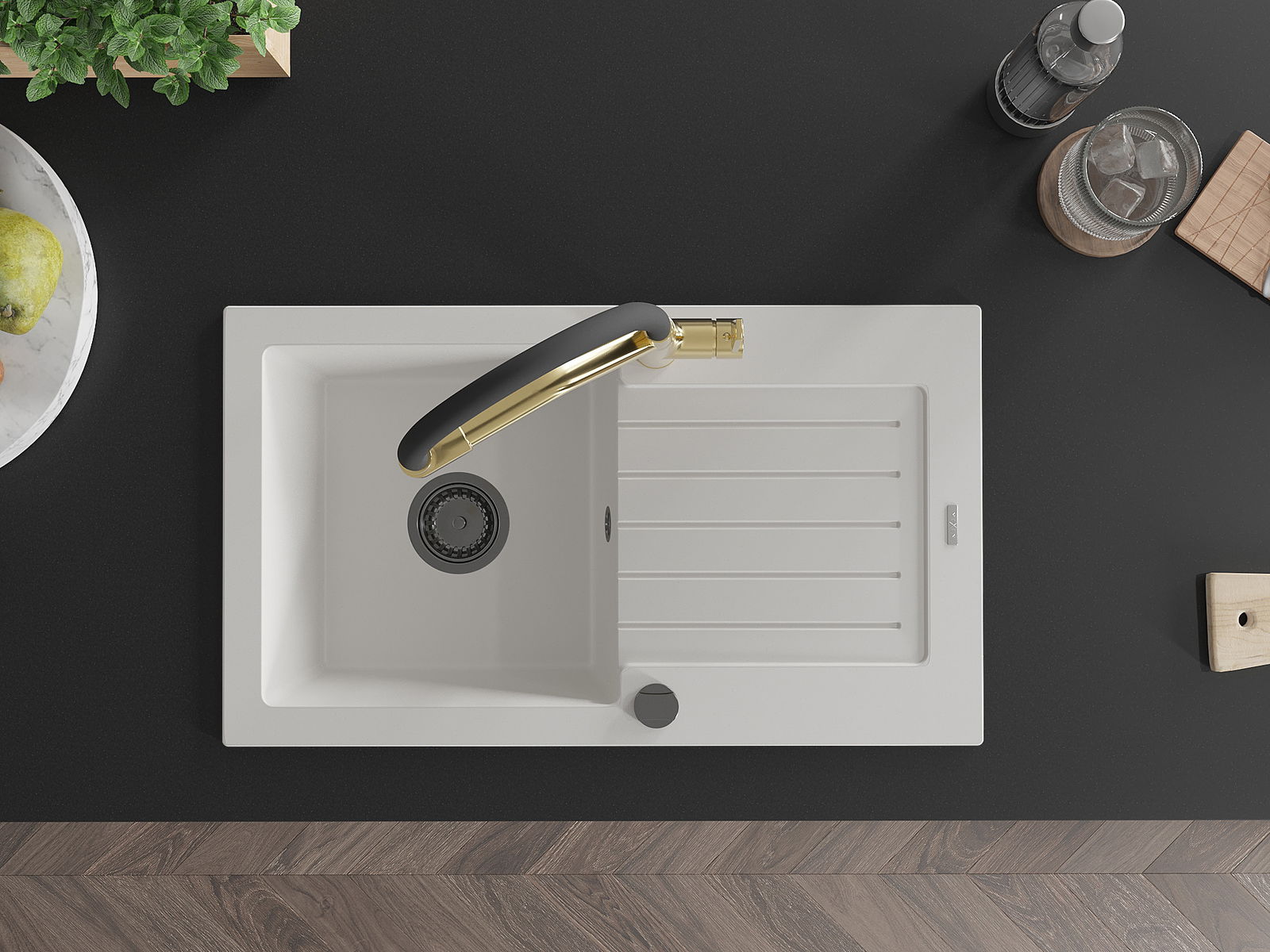 Mexen Pablo granitový dřez 1-komorový s odkapávačem a kuchyňskou baterií Duo, bílý - 6510-20-671701-57-B
