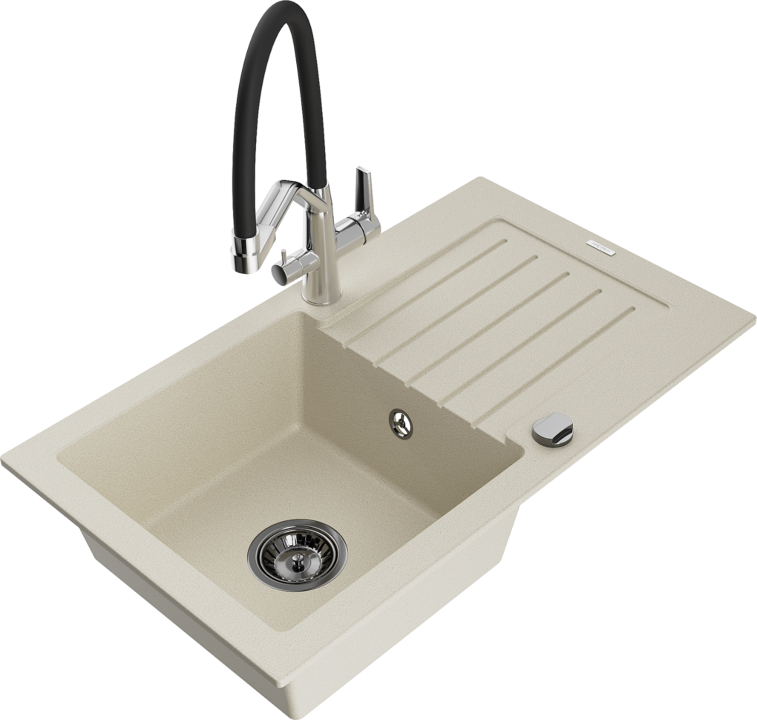 Mexen Pablo granitový dřez 1-komorový s odkapávačem a kuchyňskou baterií Duo, béžový - 6510-69-671701-07-B