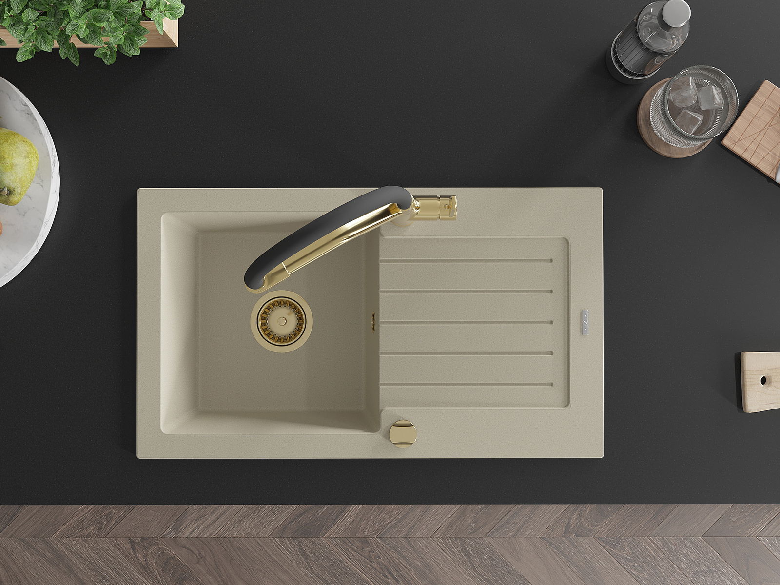 Mexen Pablo granitový dřez s 1 komorou, odkapávačem a kuchyňskou baterií Duo, béžový - 6510-69-671701-57-G